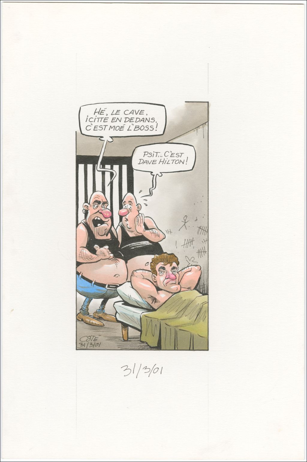 [Prisonnier 1 ] : « Hé, le cave, icitte en dedans, c'est moé l'boss ! » [Prisonnier 2] : « Psit… c'est Dave Hilton ! »