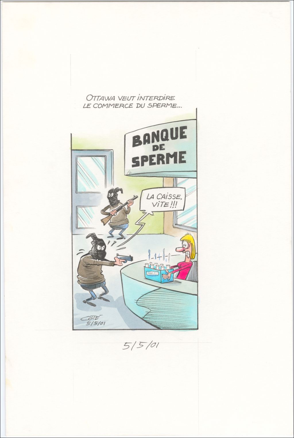 Ottawa veut interdire le commerce du sperme… "La caisse vite!!!", 5 mai 2001, Archives nationales à Québec, Fonds André-Philippe Côté, (03Q,P687,S1,P2001-05-05), André-Philippe Côté.