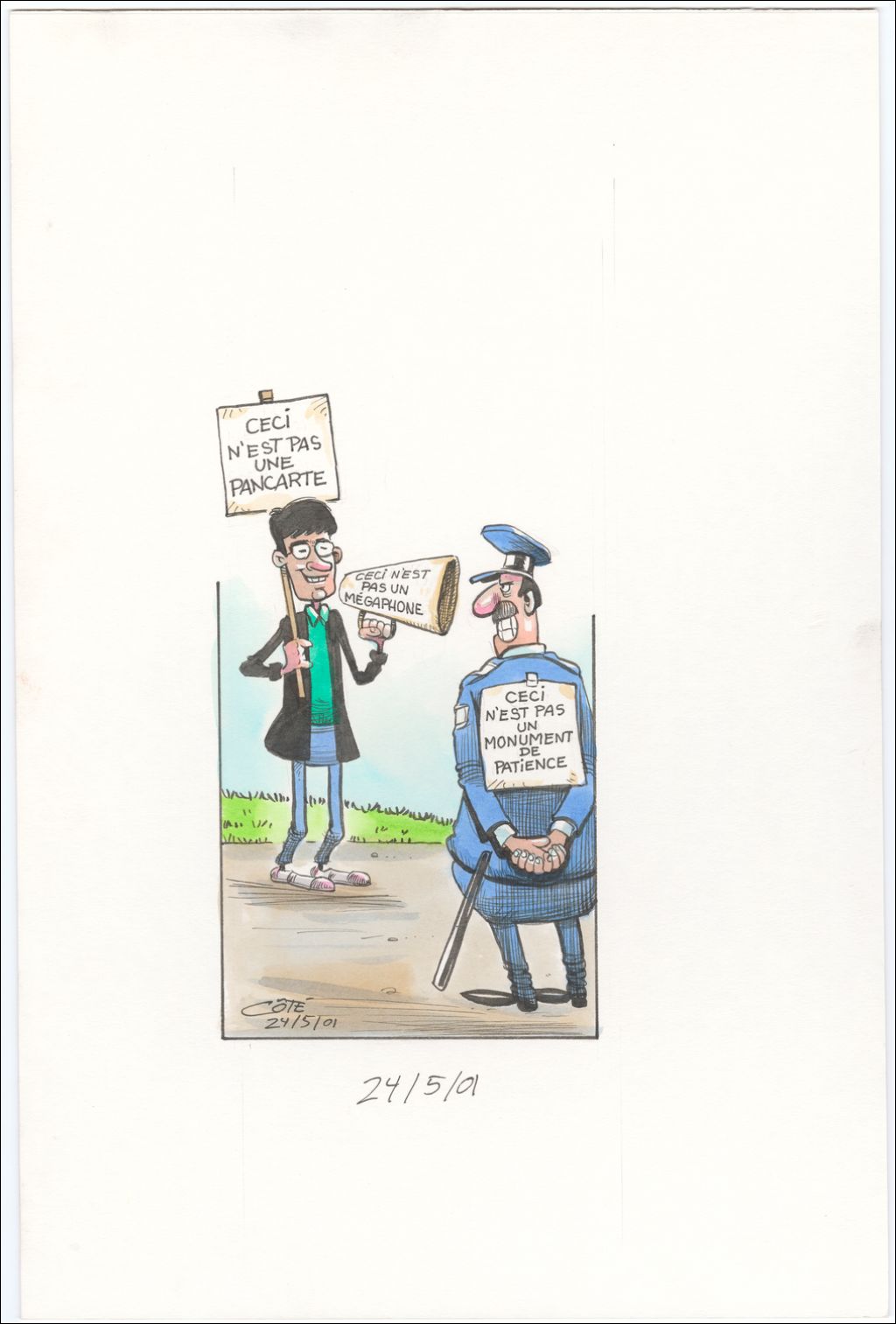 Ceci n'est pas une pancarte, ceci n'est pas un megaphone, ceci n'est pas un monument de patience, 24 mai 2001, Archives nationales à Québec, Fonds André-Philippe Côté, (03Q,P687,S1,P2001-05-24), André-Philippe Côté.