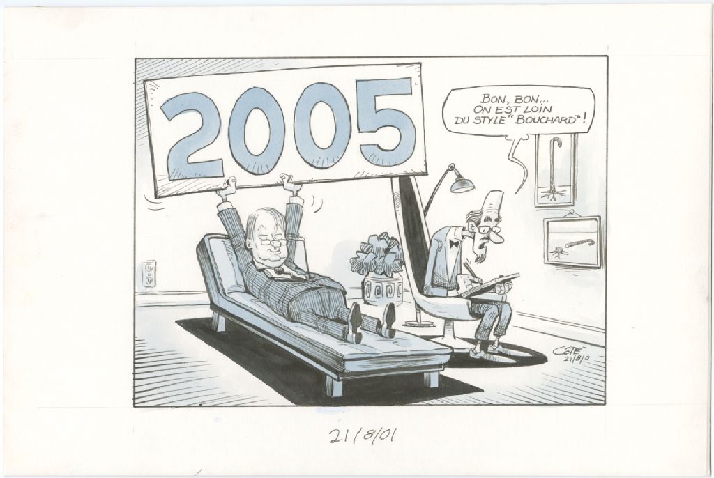 [Thérapeute] : « Bon, bon… on est loin du style "Bouchard" ! », 21 août 2001, Archives nationales à Québec, Fonds André-Philippe Côté, (03Q,P687,S1,P2001-08-21), André-Philippe Côté.