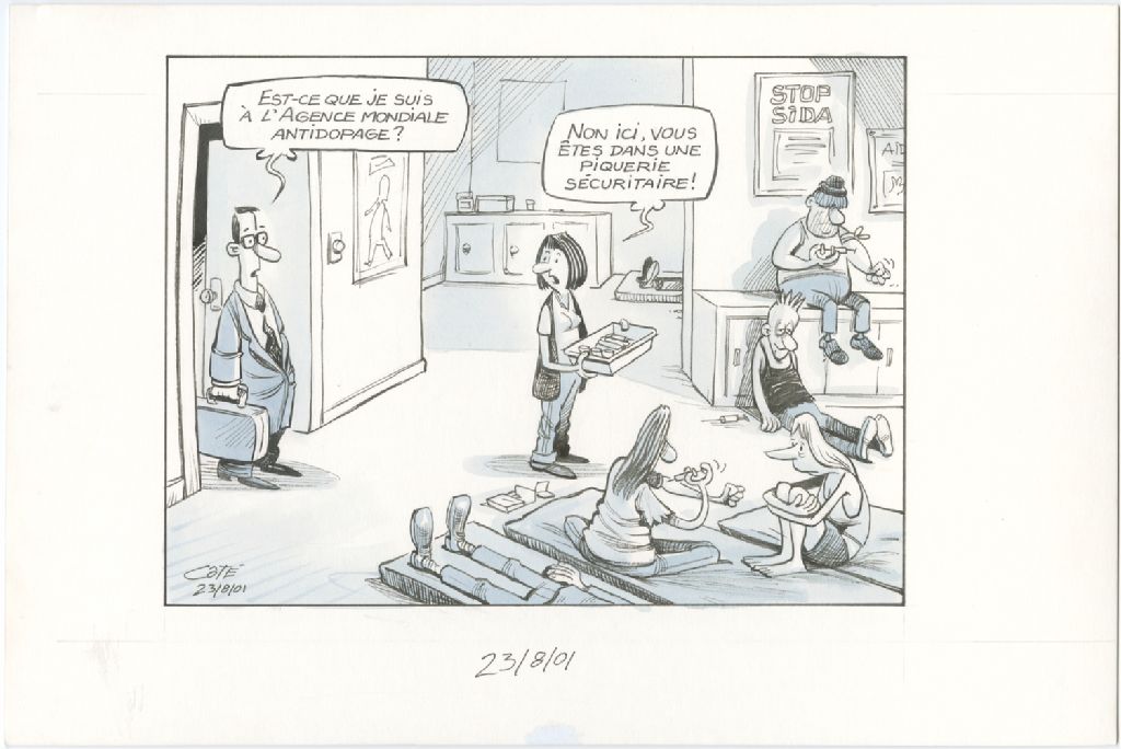 [Homme] : « Est-ce que je suis à l'Agence mondiale antidopage ? » [Femme] : « Non ici, vous êtes dans une piquerie sécuritaire ! »