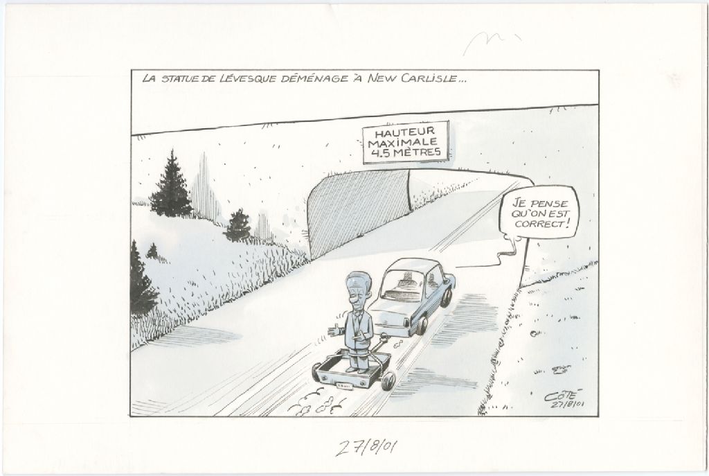 La statue de Lévesque déménage à New Carlisle, 27 août 2001, Archives nationales à Québec, Fonds André-Philippe Côté, (03Q,P687,S1,P2001-08-27), André-Philippe Côté.
