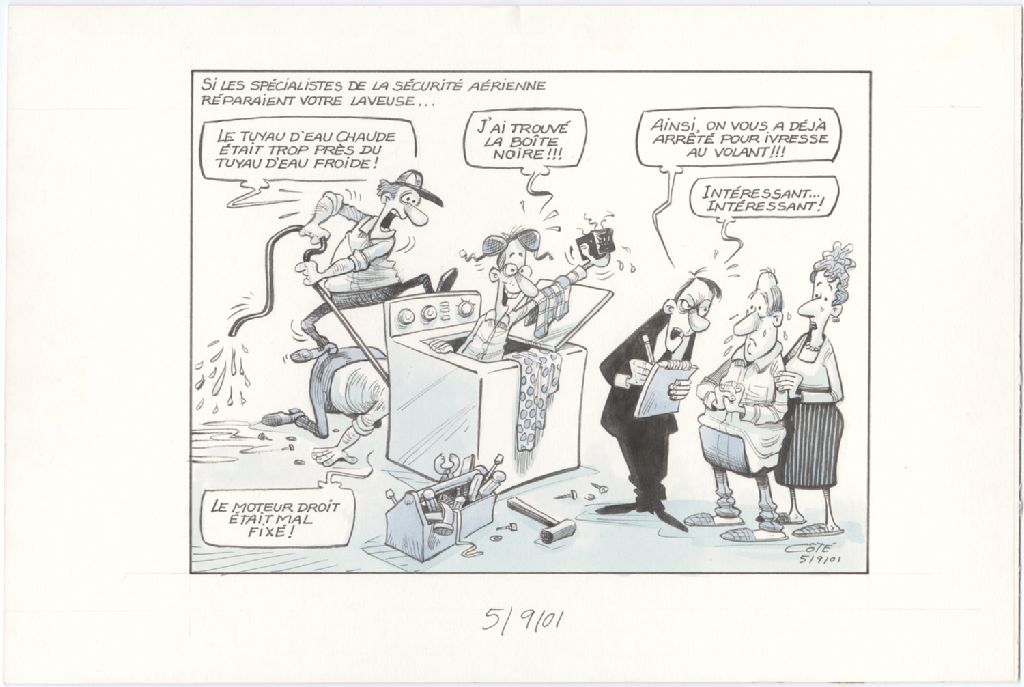 Si les spécialistes de la sécurité aérienne réparaient votre laveuse, 5 septembre 2001, Archives nationales à Québec, Fonds André-Philippe Côté, (03Q,P687,S1,P2001-09-05-1), André-Philippe Côté.