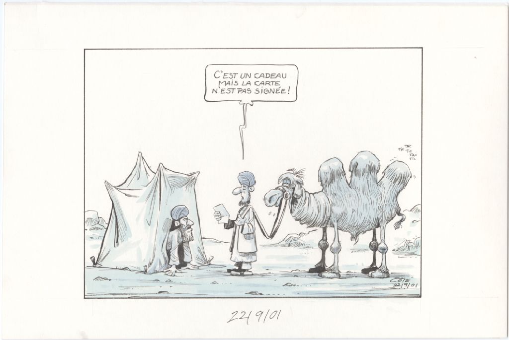 [Homme du Moyen-Orient] : « C'est un cadeau mais la carte n'est pas signée ! », 22 septembre 2001, Archives nationales à Québec, Fonds André-Philippe Côté, (03Q,P687,S1,P2001-09-22-1), André-Philippe Côté.