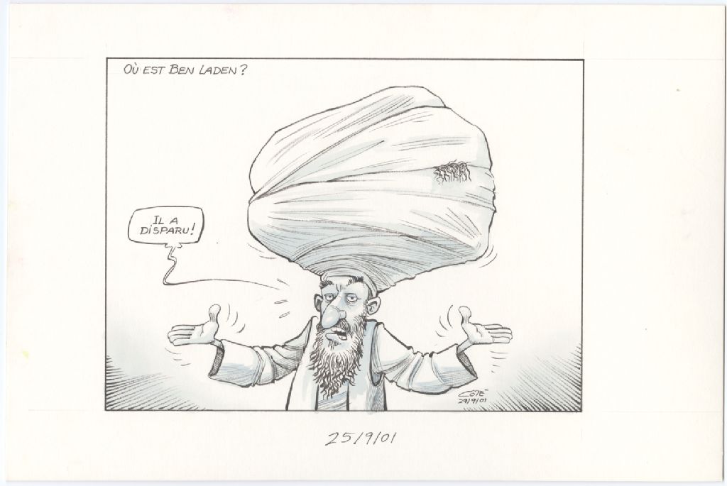 Où est Ben Laden ? [Homme du Moyen-Orient] : « Il a disparu ! », 25 septembre 2001, Archives nationales à Québec, Fonds André-Philippe Côté, (03Q,P687,S1,P2001-09-25-1), André-Philippe Côté.