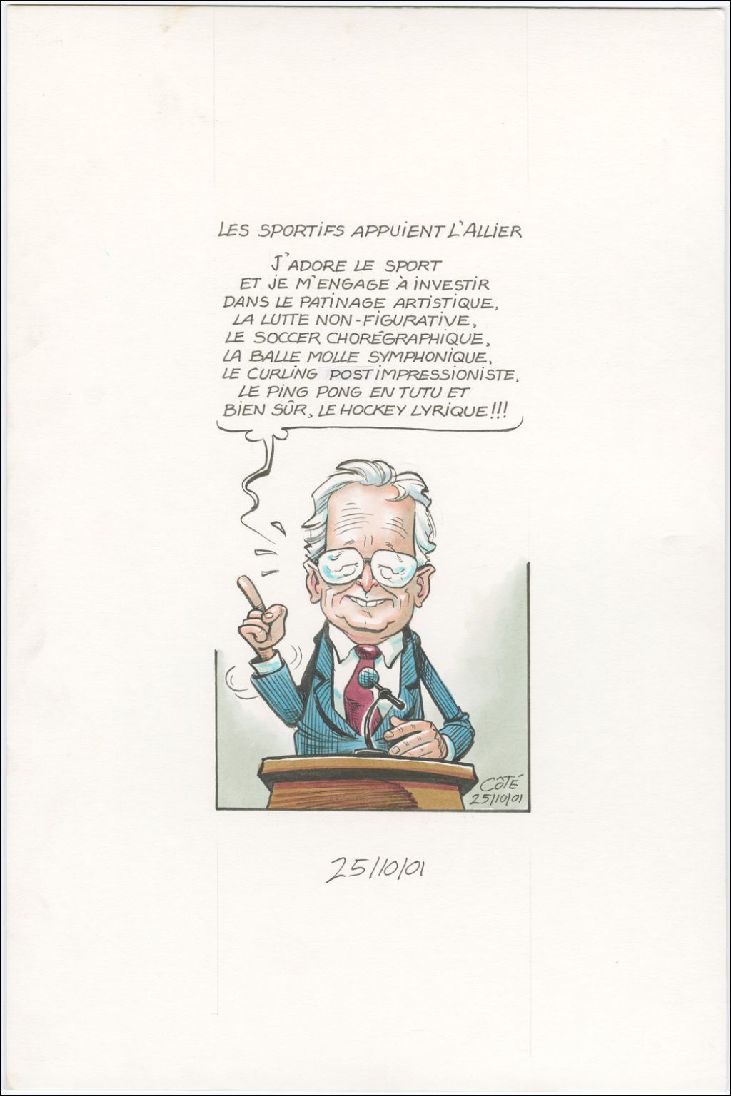 [Jean-Paul L'Allier] : « J'adore le sport et je m'engage à investir dans le patinage artistique, la lutte non-figurative, le soccer chorégraphique, la balle molle symphonique, le curling post impressioniste, le ping pong en tutu et bien sûr, le hockey lyrique !!! »