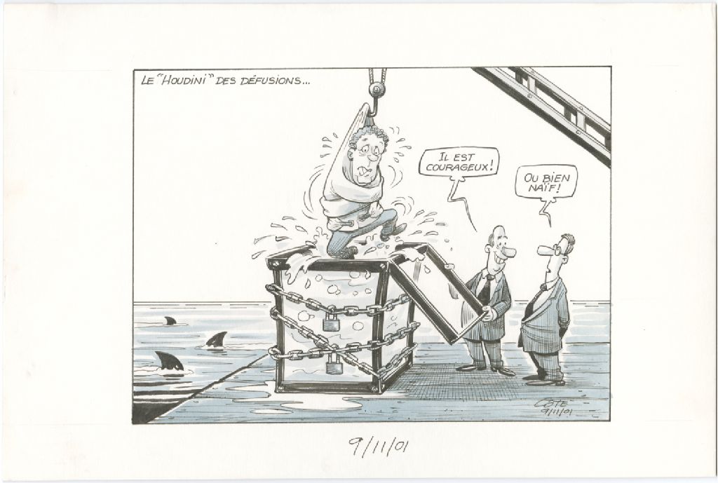 Le "Houdini" des défusions… [Jean Charest], 9 novembre 2001, Archives nationales à Québec, Fonds André-Philippe Côté, (03Q,P687,S1,P2001-11-09-1), André-Philippe Côté.