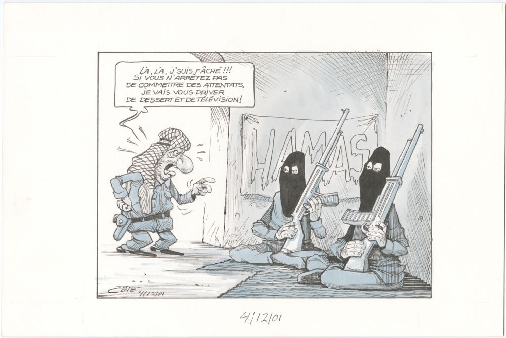 [Yasser Arafat] : « Là, là, j'suis fâché !!! Si vous n'arrêtez pas de commettre des attentats, je vais vous priver de dessert et de télévision ! », 4 décembre 2001, Archives nationales à Québec, Fonds André-Philippe Côté, (03Q,P687,S1,P2001-12-04-1), André-Philippe Côté.