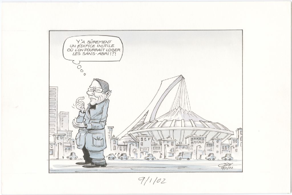 [Gérald Tremblay] : « Y'a sûrement un édifice inutile où l'on pourrait loger les sans-abri !?! », 9 janvier 2002, Archives nationales à Québec, Fonds André-Philippe Côté, (03Q,P687,S1,P2002-01-09-1), André-Philippe Côté.