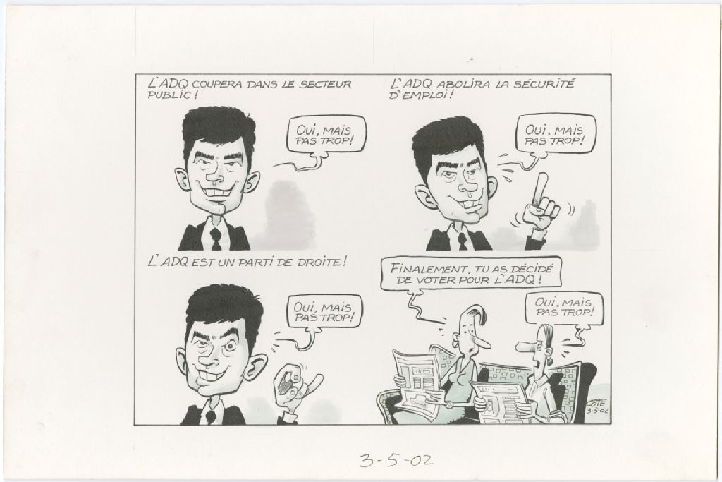L'ADQ coupera dans le secteur public ! [Mario Dumont] : « Oui, mais pas trop ! », 3 mai 2002, Archives nationales à Québec, Fonds André-Philippe Côté, (03Q,P687,S1,P2002-05-03-1), André-Philippe Côté.