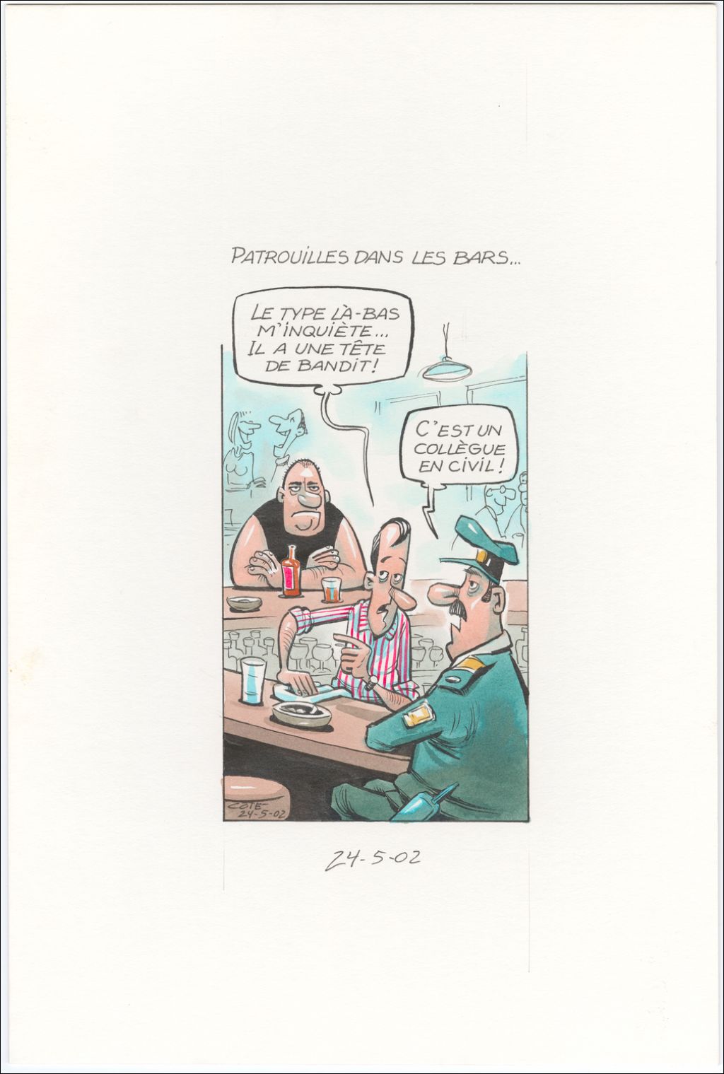 [Barman] : « Le type là-bas m'inquiète¿ il a une tête de bandit ! » [Policier] : « C'est un collègue en civil ! »