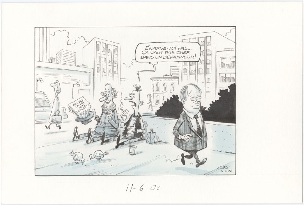 [Sans-abri] : « Énarve-toi pas… ça vaut pas cher dans un dépanneur ! », 11 juin 2002, Archives nationales à Québec, Fonds André-Philippe Côté, (03Q,P687,S1,P2002-06-11), André-Philippe Côté.