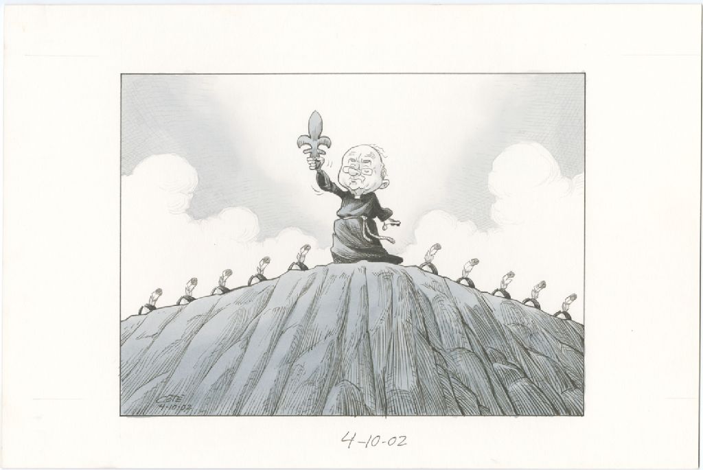 [Guy Chevrette tient l'emblème du Québec. Des indiens (avec plumes) se trouvent derrière lui.]