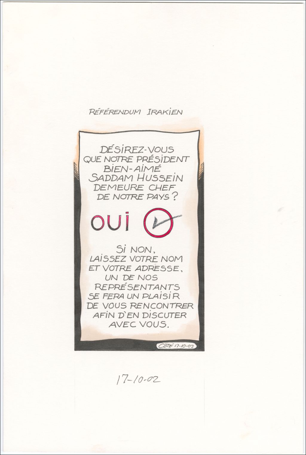 [Désirez-vous que notre président bien-aimé Saddam Hussein demeure chef de notre pays ? OUI. Si non, laissez votre nom et votre adresse, un de nos représentants se fera un plaisir de vous rencontrer afin d'en discuter avec vous.]