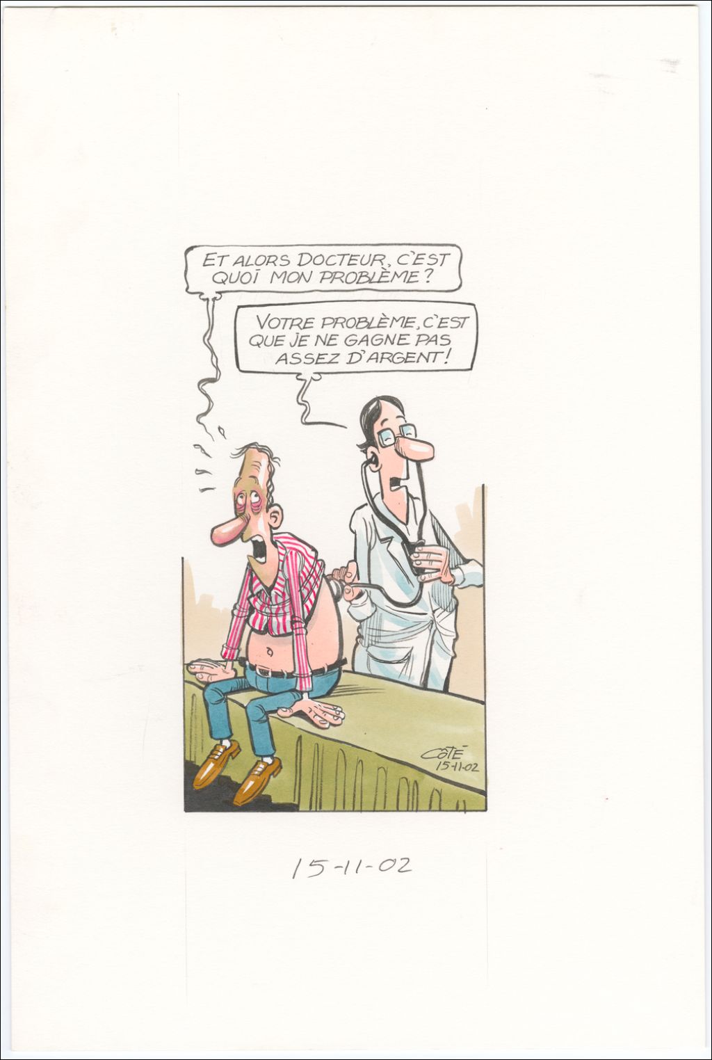 [Patient] : « Et alors docteur, c'est quoi mon problème ? », 15 novembre 2002, Archives nationales à Québec, Fonds André-Philippe Côté, (03Q,P687,S1,P2002-11-15), André-Philippe Côté.