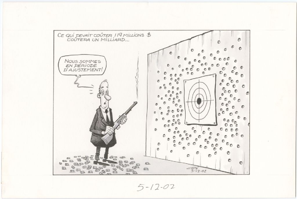 Ce qui devait coûter 119 millions $ coûtera un milliard, 5 décembre 2002, Archives nationales à Québec, Fonds André-Philippe Côté, (03Q,P687,S1,P2002-12-05-1), André-Philippe Côté.