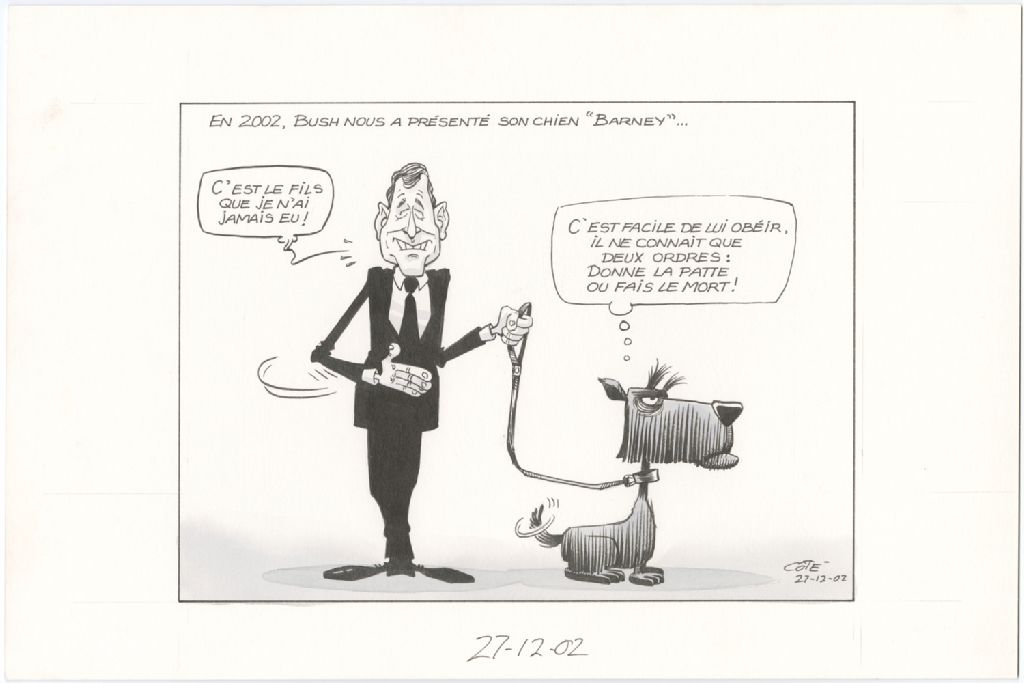 En 2002, [George] Bush a présenté son chien "Barney", 27 décembre 2002, Archives nationales à Québec, Fonds André-Philippe Côté, (03Q,P687,S1,P2002-12-27), André-Philippe Côté.