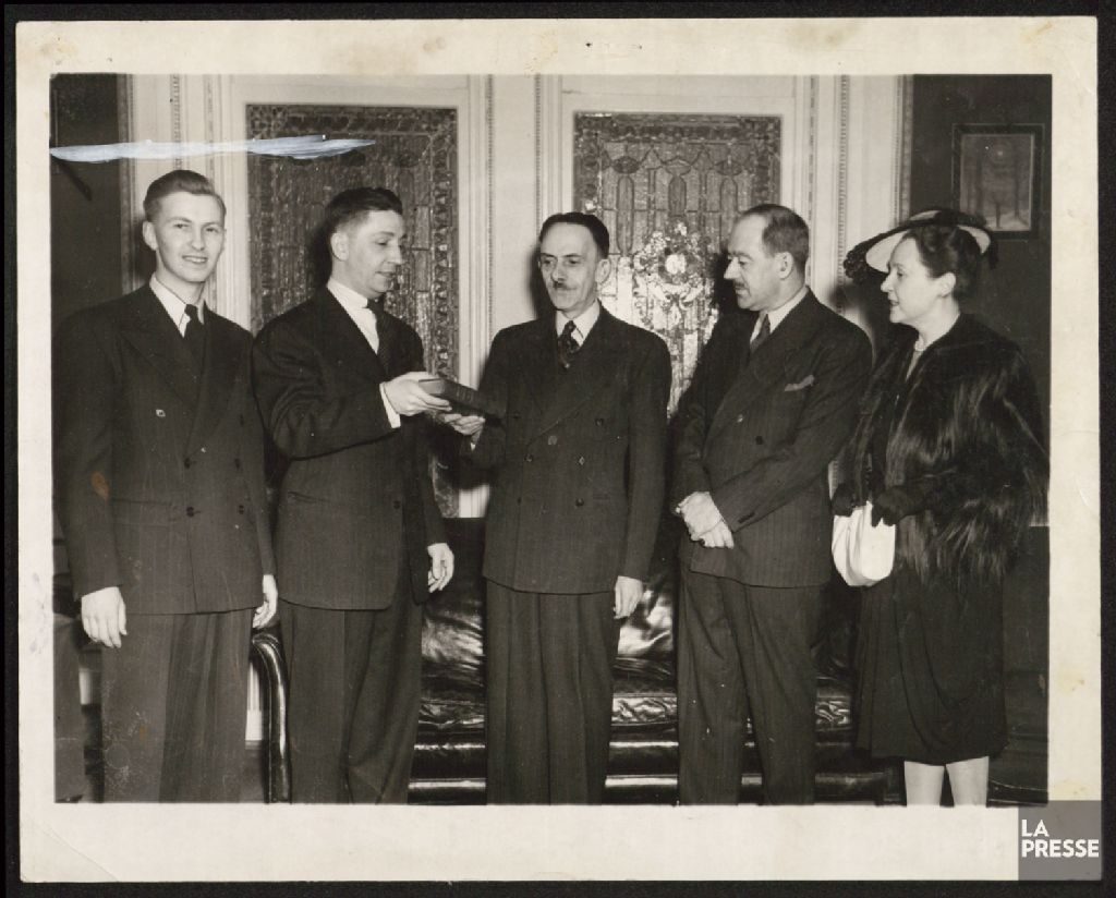 - Le document montre Philippe "Ringuet" Panneton accompagné de Paul Péladeau, André Dussault et Hector Perrier et son épouse