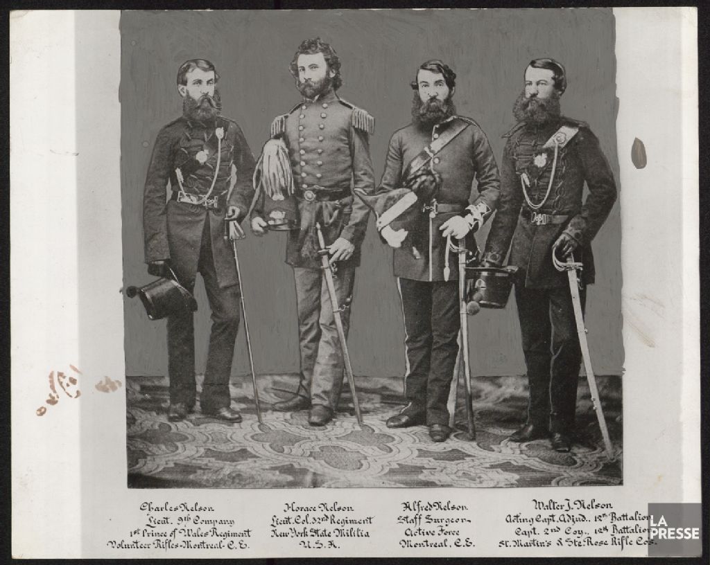 Le document montre les fils de Woldred Nelson : Charles, Horace, Arthur et Walter en habits militaires