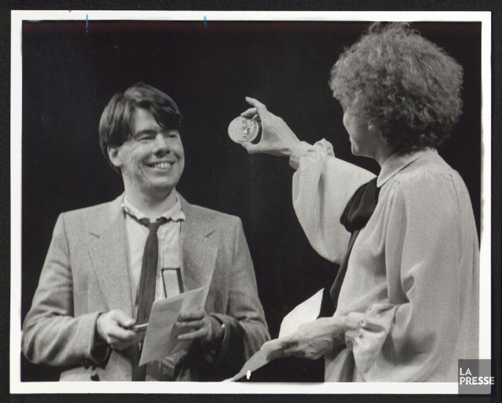 Le dossier illustre François Charron recevant le prix Émile-Nelligan remis par Monique Leyrac