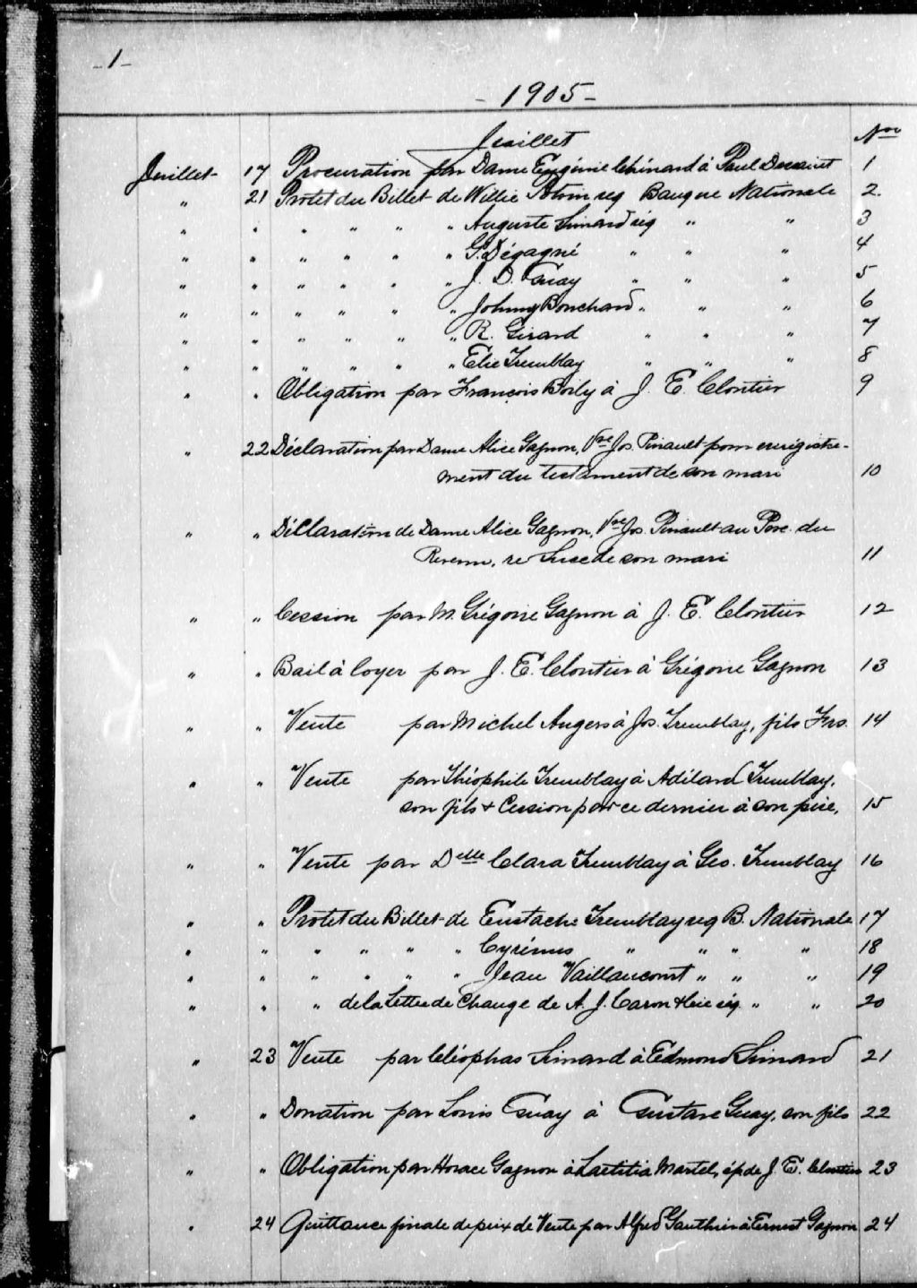 - Cette série regroupe les minutes notariales du greffe de Georges-Antoine Saint-Pierre, elle compte 18544 pièces numérotées conservées dans des chemises numérotées, trois registres de répertoires et quatre registres d'index pertinents.Prises dans leur ensemble, les données colligées dans ces documents officiels à contenu administratif et légal peuvent constituer une source documentaire des plus révélatrices sur le mode et les conditions de vie de la population pendant cette période (métiers et professions mentionnés aux contrats, inventaires de biens, testaments), sur les classes sociales (mention de titres correspondant au rang social des parties concernées tels bourgeois, écuyer, etc), sur les moeurs et coutumes acceptées par la société et ses institutions (par le biais de déclarations, de jugement arbitral, d'injonctions, d'ordonnances, etc), et, dans une proportion moindre, sur la médecine d'époque et ses représentants. Enfin, la terminologie utilisée dans ces contrats notariés pourrait être avantageusement récupérée dans le cadre d'études portant sur l'évolution du langage administratif et légal, voire même sur l'évolution de la langue française.Voici les minutes qui sont accompagnées de documents qui n'ont pas été numérisés :17552159 : avec minute et 2 documents30473126465366046739726674968239835188198878916492509438112171165011651 : 3 documents1181312359 : 3 documents12379 avec minute12463 avec minute128601383214242 : avec minute1443814978 : avec minute15136 : 2 documents - plan maison ouvrier type B151771525815386 : avec minute