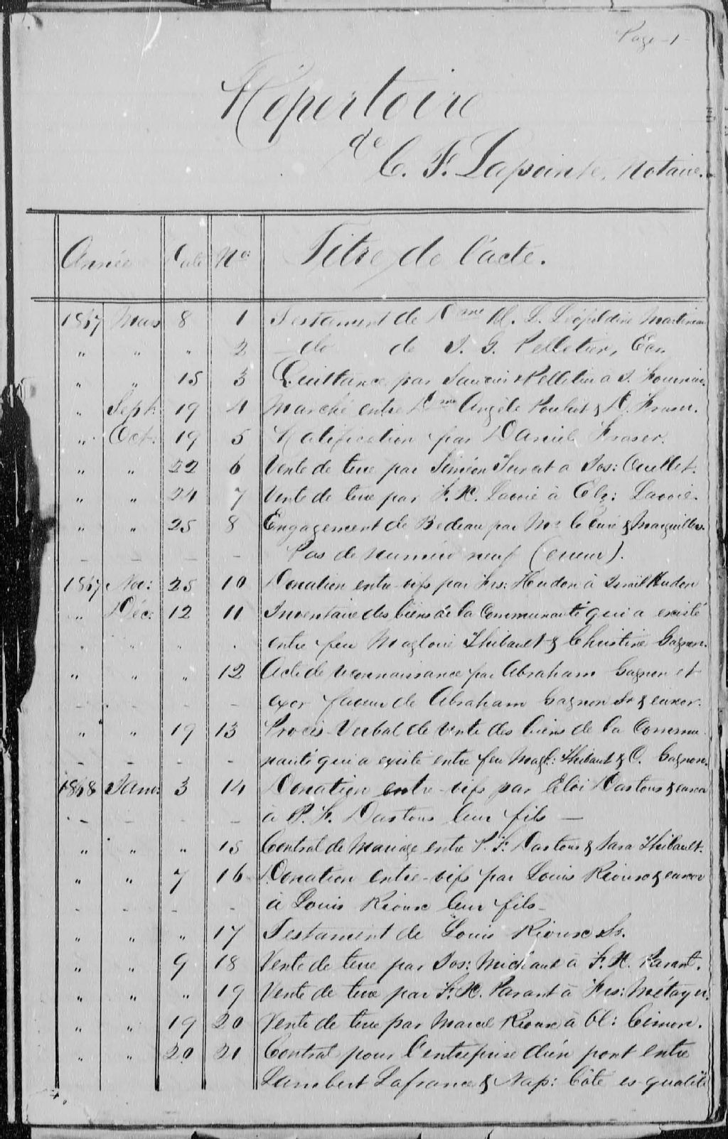 - Cette série témoigne de la vie quotidienne d'une partie de la population établie sur le territoire du Bas-Saint-Laurent et des actes légaux enregistrés chez le notaire Charles-François Lapointe. La vie économique et les moeurs et coutumes du XIXe siècle dans le Bas-Saint-Laurent peuvent être étudiés à l'aide de ces documents. De plus, les liens familiaux décrits dans les actes peuvent aisément servir pour des études généalogiques. Ces minutes notariales sont issues des régions de Sainte-Flavie et de Sainte-Cécile-du-Bic.Cette série comprend une sous-série des actes notariés contenant 678 minutes notariales, une sous-série pour le répertoire et une sous-série pour l'index. Le répertoire est relié en une seule pièce et regroupe toutes les minutes notariales de Charles-François Lapointe. L'index est aussi relié en une seule pièce et il comprend l'ensemble des personnes impliquées dans les actes du notaire Lapointe. Les documents se [...]