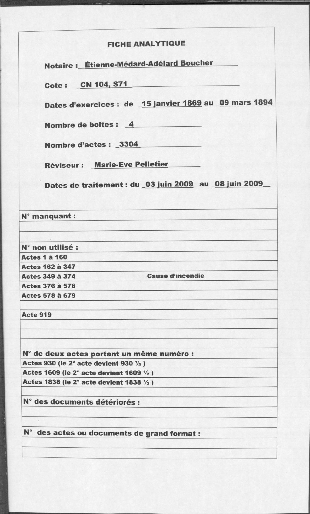 Étienne-Médard-Adélard Boucher, 1866-1894, Archives nationales à Rimouski, Fonds Cour supérieure. District judiciaire de Kamouraska. Greffes de notaires, (01R,CN104,S71).