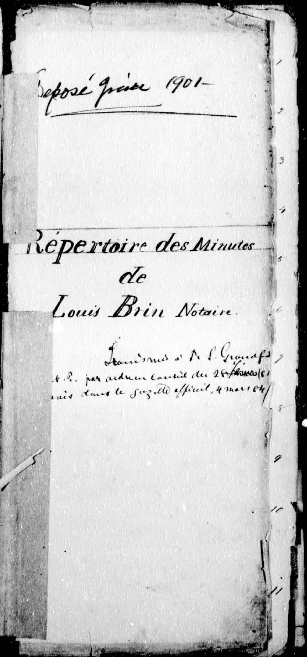 Louis Brin, 1871-1883, Archives nationales à Sherbrooke, Fonds Cour supérieure. District judiciaire de Bedford. Greffes de notaires, (05S,CN502,S13).
