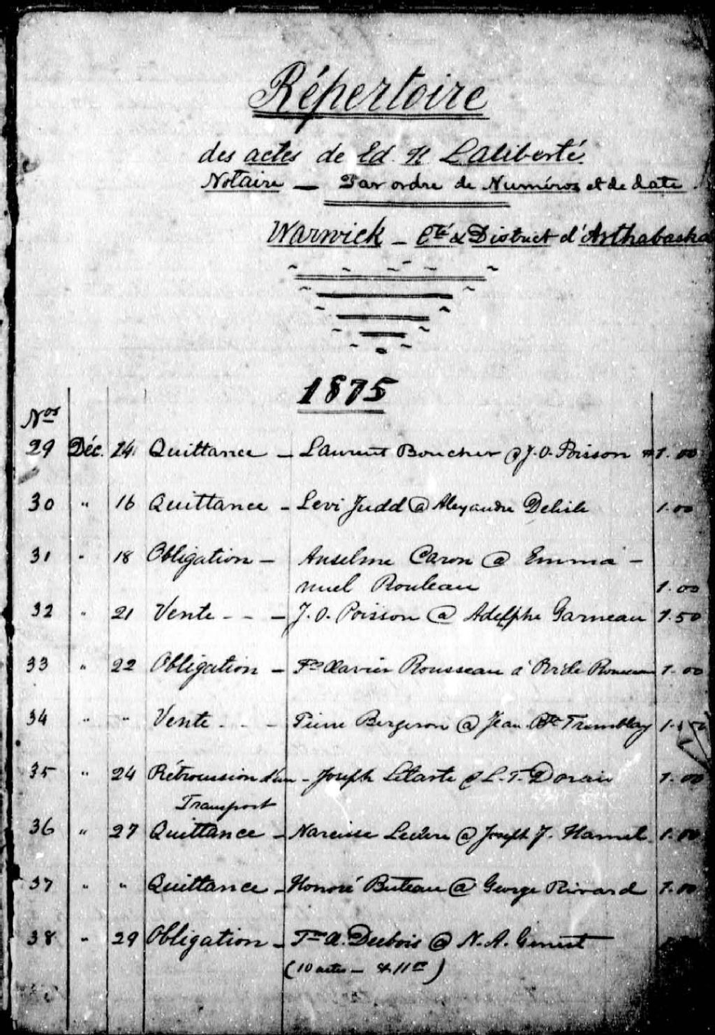 - Cette série regroupe les minutes notariales du greffe du notaire Édouard-Hippolyte Laliberté (4921 pièces numérotées 28 à 4929) et six (6) répertoires originaux pertinents.Les numéros suivants n'existent pas au répertoire ni dans le greffe : 923, 935, 1679, 1744, 1955, 2736, 4339, 4576, 4777, 4778, 4801-4802, 4813-4816, 4825-4828, 4833-4836, 4838, 4842-4848, 4856, 4857, 4865, 4870, 4871, 4878-4881, 4883, 4884, 4891-4896, 4901-4907, 4909-4914, 4923-4928.Les numéros d'actes suivants sont manquants dans le greffe : 1-28.Outre les informations spécifiques aux parties impliquées dans chacun des contrats consignés dans ce greffe, lesquelles peuvent être utilisées, entre autre, dans le cadre de recherches à caractère généalogique, cette série constitue, dans un premier temps, une source documentaire intéressante sur le mode de fonctionnement de la société. D'autre part, prises dans leur ensemble, les données colligées dans ces documents officiels à contenu administratif et légal peuvent également constituer une source documentaire des plus révélatrices sur le mode et les conditions de vie de la population pendant cette période (métiers et professions mentionnés aux contrats, inventaires de biens, testaments), sur les classes sociales (mention de titres correspondant au rang social des parties concernées tels bourgeois, écuyer, etc), sur les moeurs et coutumes acceptées par la société et ses institutions (par le biais de déclarations, de jugement arbitral, d'injonctions, d'ordonnances, etc), et, dans une proportion moindre, sur la médecine d'époque et ses représentants.Enfin, la terminologie utilisée dans ces contrats notariés pourrait être avantageusement récupérée dans le cadre d'études portant sur l'évolution du langage administratif et légal, voire même sur l'évolution de la langue française