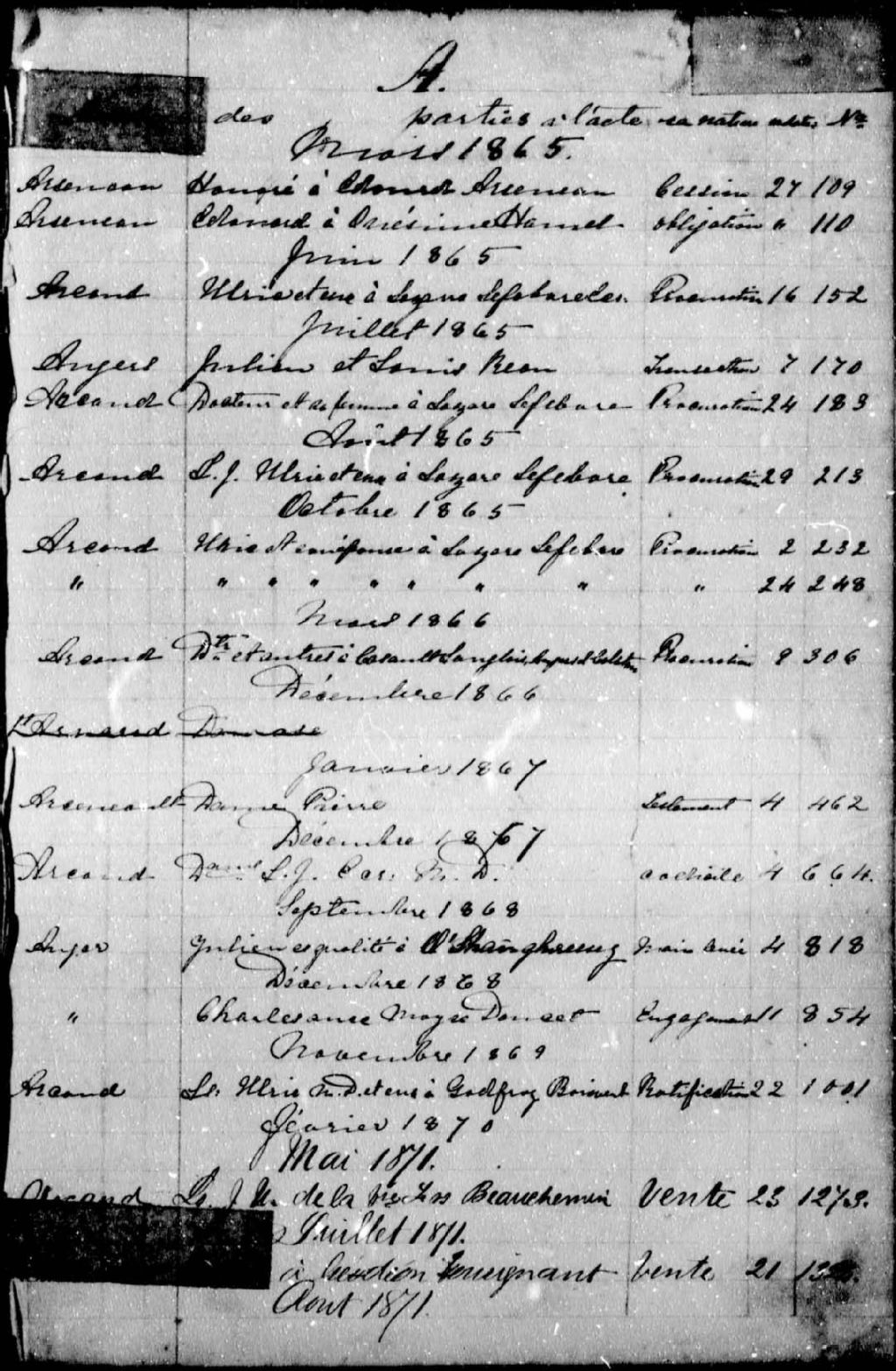 - Cette série regroupe les minutes notariales du greffe de Joseph-Achille Blondin ainsi qu'un répertoire onomastique en 2 volumes. Les minutes sont numérotées de 1 à 9512. Celles portant les numéros suivants sont manquantes : 1938, 2361, 2366, 2694, 2723, 2868, 2879, 2849 à 2857, 2864, 3220, 4226 à 4229, 4466, 6027, 7370, 7372, 7385, 7867, 7884, 7930 à 7938, 7943, 8074, 8151, 8576 et 9053. De 1864 à 1909, le notaire Blondin a exercé à Bécancour (du 21 octobre 1864 au 26 novembre 1909).Prises dans leur ensemble, les données colligées dans ces documents officiels à contenu administratif et légal peuvent également constituer une source documentaire des plus révélatrices sur le mode et les conditions de vie de la population pendant cette période (métiers et professions mentionnés aux contrats, inventaires de biens, testaments), sur les classes sociales (mention de titres correspondant au rang social des parties concernées tels bourgeois, [...]