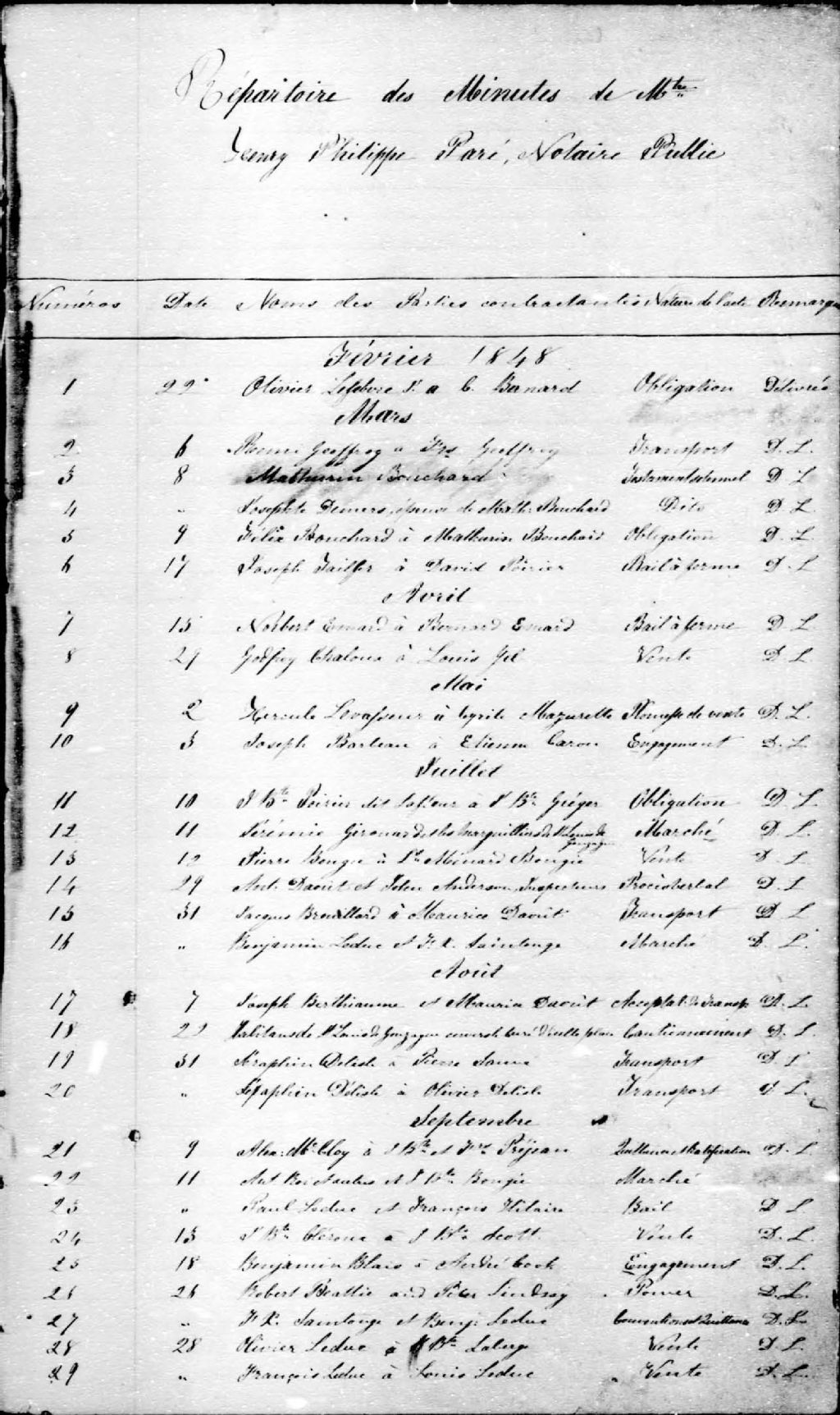 - Cette série regroupe les minutes notariales du greffe du notaire Henri-Philippe Paré (2717 pièces numérotées) et deux répertoires originaux pertinents.Outre les informations spécifiques aux parties impliquées dans chacun des contrats consignés dans ce greffe, lesquelles peuvent être utilisées, entre autre, dans le cadre de recherches à caractère généalogique, cette série constitue, dans un premier temps, une source documentaire intéressante sur le mode de fonctionnement de la société. D'autre part, prises dans leur ensemble, les données colligées dans ces documents officiels à contenu administratif et légal peuvent également constituer une source documentaire des plus révélatrices sur le mode et les conditions de vie de la population pendant cette période (métiers et professions mentionnés aux contrats, inventaires de biens, testaments), sur les classes sociales (mention de titres correspondant au rang social des parties concernées [...]