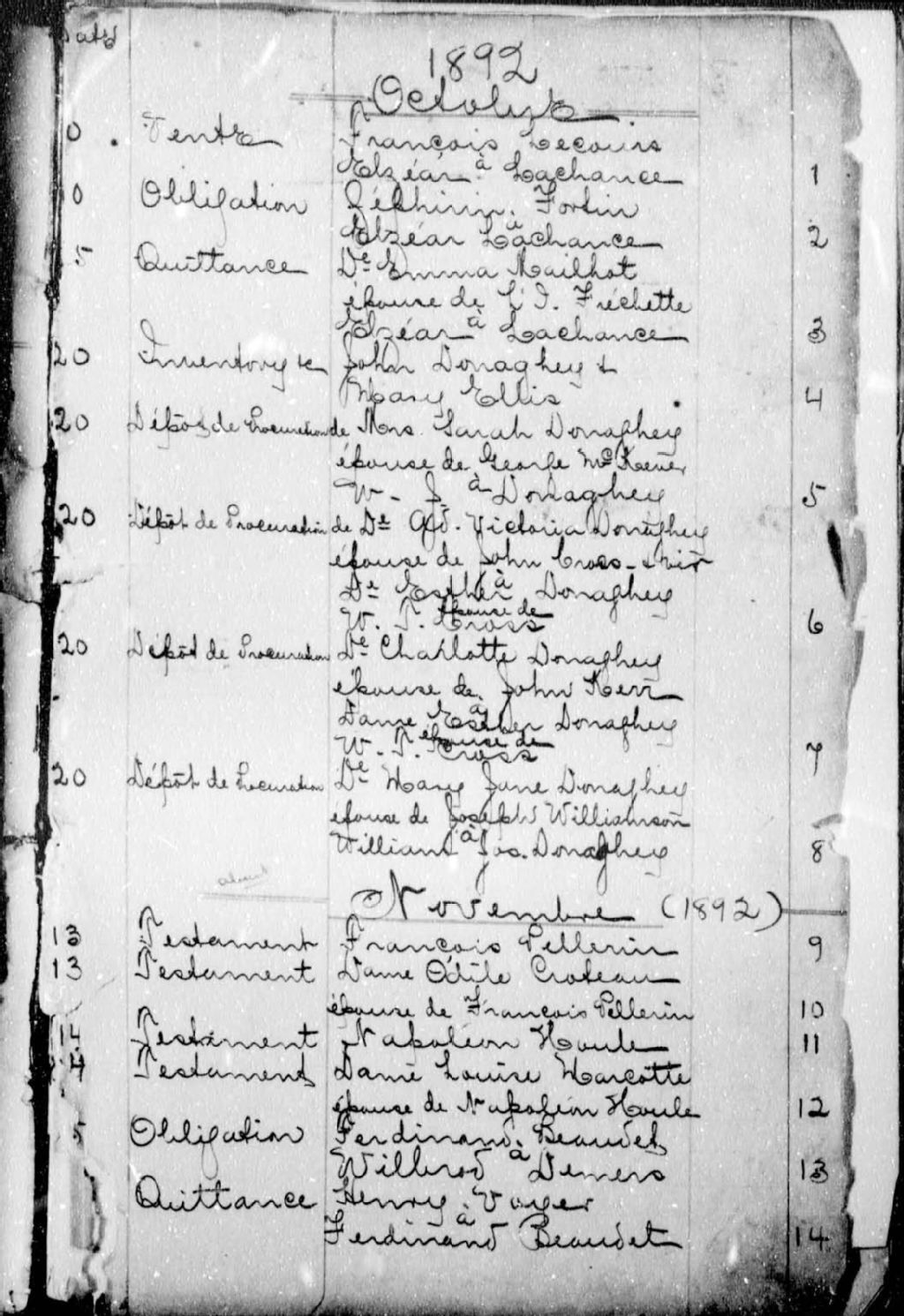- Cette série regroupe les minutes notariales du greffe de Joseph-Emile-Euclide Beauchesne ainsi que un répertoire chronologique. Les minutes sont numérotées de 1 à 2045. Toutefois, les numéros suivants ont été omis : 430-439, 461-469, 1156-1159, 1309, 1344-1383, 1561-1599, 1632-1681, 1701, 1803-1842, 1902, 1939-1969 et 2044.Outre les informations spécifiques aux parties impliquées dans chacun des contrats consignés dans ce greffe, lesquelles peuvent être utilisées, entre autre, dans le cadre de recherches à caractère généalogique, cette série constitue, dans un premier temps, une source documentaire intéressante sur le mode de fonctionnement de la société. D'autre part, prises dans leur ensemble, les données colligées dans ces documents officiels à contenu administratif et légal peuvent également constituer une source documentaire des plus révélatrices sur le mode et les conditions de vie de la population pendant cette période [...]