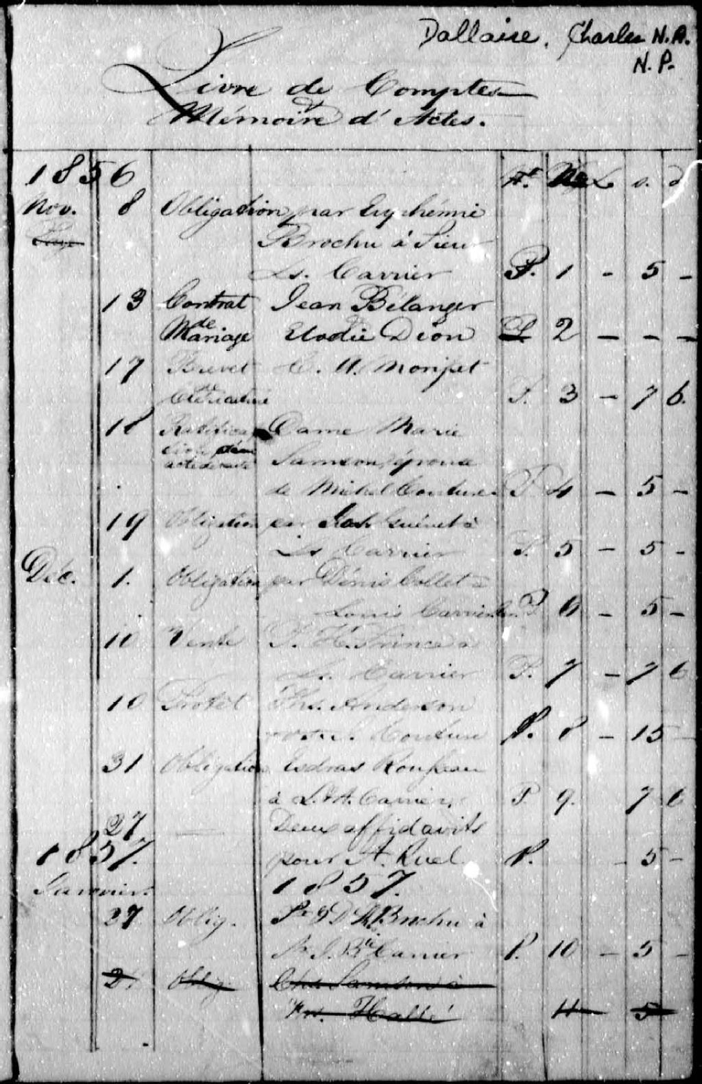 - Cette série regroupe les minutes notariales du greffe du notaire Charles-Étienne-Herménigilde Dallaire (139 pièces numérotées) et un répertoire original pertinent.Outre les informations spécifiques aux parties impliquées dans chacun des contrats consignés dans ce greffe, lesquelles peuvent être utilisées, entre autre, dans le cadre de recherches à caractère généalogique, cette série constitue, dans un premier temps, une source documentaire intéressante sur le mode de fonctionnement de la société. D'autre part, prises dans leur ensemble, les données colligées dans ces documents officiels à contenu administratif et légal peuvent également constituer une source documentaire des plus révélatrices sur le mode et les conditions de vie de la population pendant cette période (métiers et professions mentionnés aux contrats, inventaires de biens, testaments), sur les classes sociales (mention de titres correspondant au rang social des parties [...]