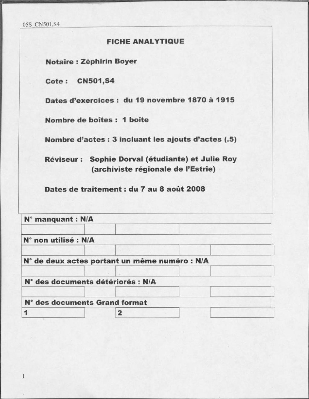 Zéphirin Boyer, 1871, Archives nationales à Sherbrooke, Fonds Cour supérieure. District judiciaire de Saint-François. Greffes de notaires, (05S,CN501,S4).