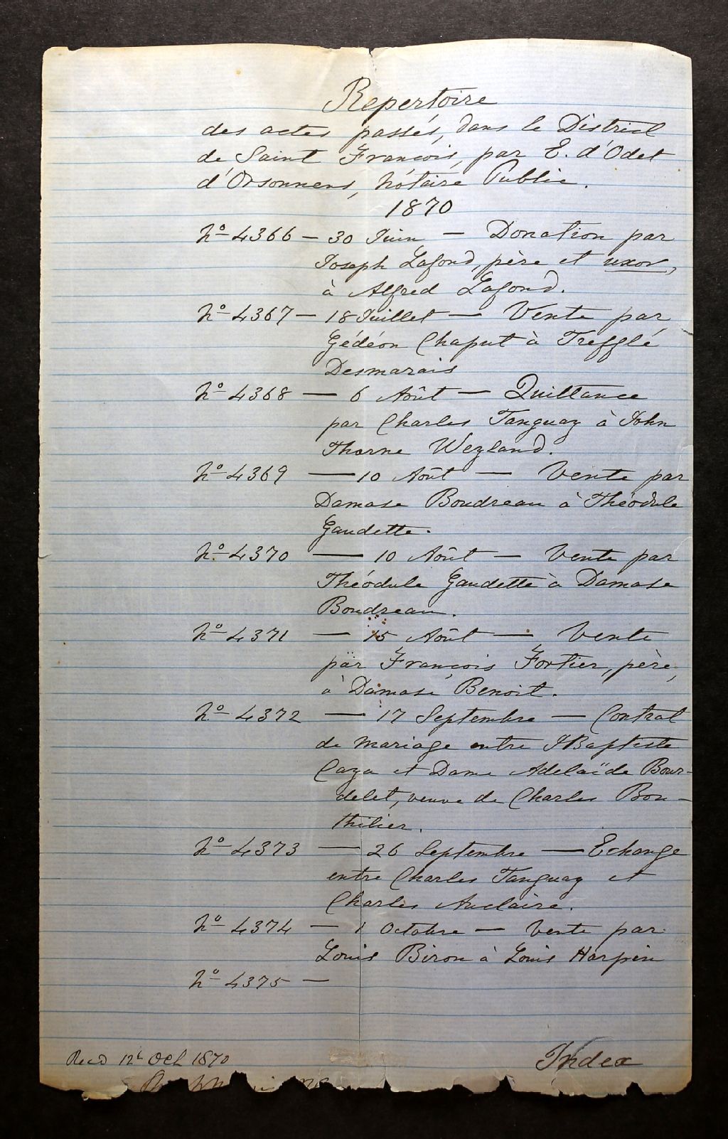 Éraste d'Odet d'Orsonnens, 1870, Archives nationales à Sherbrooke, Fonds Cour supérieure. District judiciaire de Saint-François. Greffes de notaires, (05S,CN501,S8).