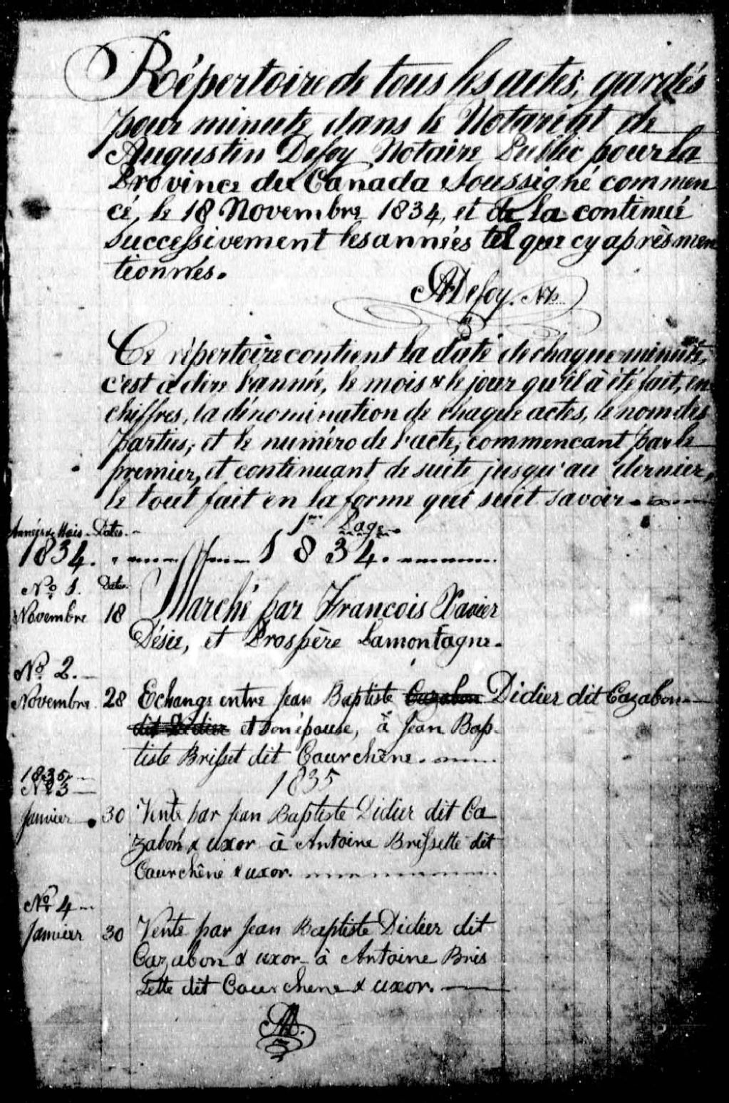 - Cette série regroupe les minutes notariales du greffe de Augustin Defoy ainsi que deux répertoires chronologiques, dont un est en deux volumes, et un répertoire onomastique. Les minutes sont numérotées de 1 à 5293. À la fin du greffe, on retrouve des pièces justificatives (quittances, obligations, protets, etc.), de 1889 à 1897.De 1834 à 1876, le notaire Defoy a exercé successivement dans le comté Berthier (du 18 novembre 1853 au 30 août 1853), à Saint-Christophe-d'Arthabaska (du 27 sptembre 1853 au 29 avril 1872) et à Saint-Pierre-les-Becquets (du 25 mai 1872 au 6 novembre 1876).Prises dans leur ensemble, les données colligées dans ces documents officiels à contenu administratif et légal peuvent constituer une source documentaire des plus révélatrices sur le mode et les conditions de vie de la population pendant cette période (métiers et professions mentionnés aux contrats, inventaires de biens, testaments), sur les classes sociales [...]