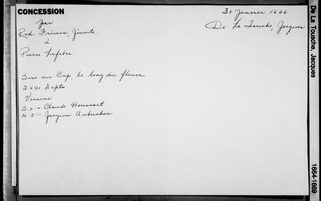 - Cette série regroupe 429 pièces judiciaires et notariales du greffe de Jacques de Latouche ainsi qu'un répertoire chronologique. De 1664 à 1669, le notaire De Latouche a exercé à Cap-de-la-Madeleine (du 11 août 1664 au 29 mai 1669).Prises dans leur ensemble, les données colligées dans ces documents officiels à contenu administratif et légal peuvent constituer une source documentaire des plus révélatrices sur le mode et les conditions de vie de la population pendant cette période (métiers et professions mentionnés aux contrats, inventaires de biens, testaments), sur les classes sociales (mention de titres correspondant au rang social des parties concernées tels bourgeois, écuyer, etc), sur les moeurs et coutumes acceptées par la société et ses institutions (par le biais de déclarations, de jugement arbitral, d'injonctions, d'ordonnances, etc), et, dans une proportion moindre, sur la médecine d'époque et ses représentants.Enfin, la terminologie utilisée dans ces contrats notariés pourrait être avantageusement récupérée dans le cadre d'études portant sur l'évolution du langage administratif et légal, voire même sur l'évolution de la langue française