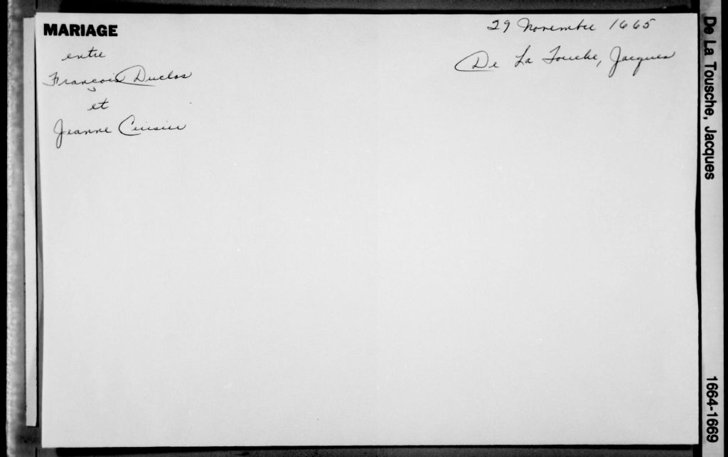 - Cette série regroupe 429 pièces judiciaires et notariales du greffe de Jacques de Latouche ainsi qu'un répertoire chronologique. De 1664 à 1669, le notaire De Latouche a exercé à Cap-de-la-Madeleine (du 11 août 1664 au 29 mai 1669).Prises dans leur ensemble, les données colligées dans ces documents officiels à contenu administratif et légal peuvent constituer une source documentaire des plus révélatrices sur le mode et les conditions de vie de la population pendant cette période (métiers et professions mentionnés aux contrats, inventaires de biens, testaments), sur les classes sociales (mention de titres correspondant au rang social des parties concernées tels bourgeois, écuyer, etc), sur les moeurs et coutumes acceptées par la société et ses institutions (par le biais de déclarations, de jugement arbitral, d'injonctions, d'ordonnances, etc), et, dans une proportion moindre, sur la médecine d'époque et ses représentants.Enfin, la terminologie utilisée dans ces contrats notariés pourrait être avantageusement récupérée dans le cadre d'études portant sur l'évolution du langage administratif et légal, voire même sur l'évolution de la langue française