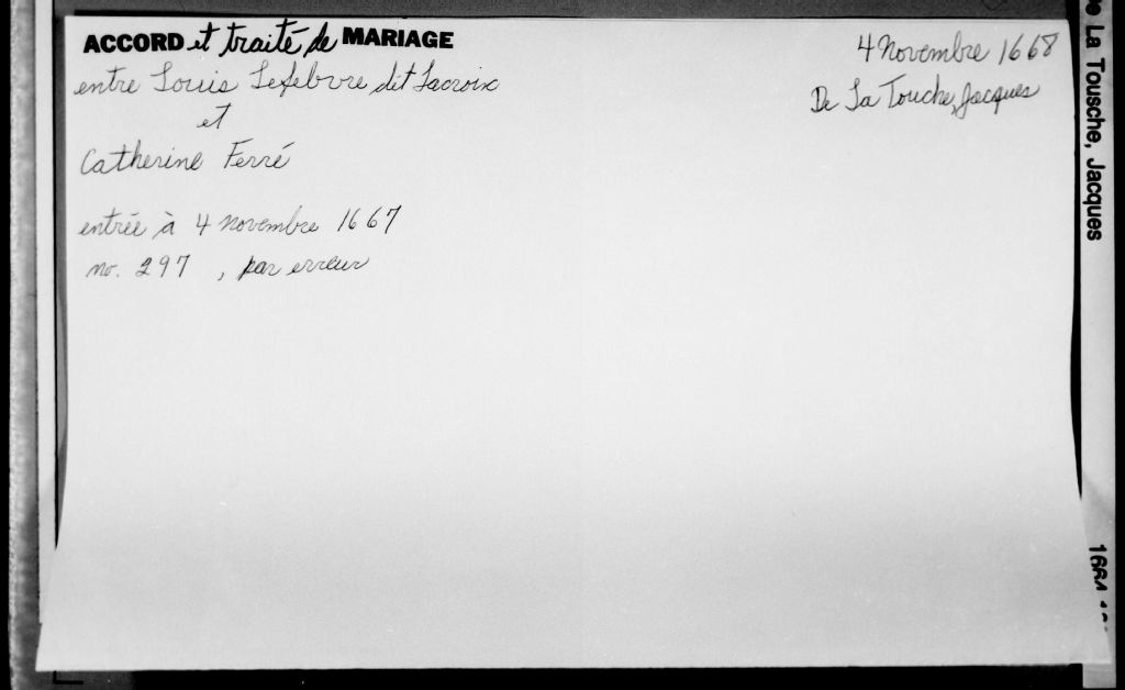 Cette série regroupe 429 pièces judiciaires et notariales du greffe de Jacques de Latouche ainsi qu'un répertoire chronologique. De 1664 à 1669, le notaire De Latouche a exercé à Cap-de-la-Madeleine (du 11 août 1664 au 29 mai 1669).Prises dans leur ensemble, les données colligées dans ces documents officiels à contenu administratif et légal peuvent constituer une source documentaire des plus révélatrices sur le mode et les conditions de vie de la population pendant cette période (métiers et professions mentionnés aux contrats, inventaires de biens, testaments), sur les classes sociales (mention de titres correspondant au rang social des parties concernées tels bourgeois, écuyer, etc), sur les moeurs et coutumes acceptées par la société et ses institutions (par le biais de déclarations, de jugement arbitral, d'injonctions, d'ordonnances, etc), et, dans une proportion moindre, sur la médecine d'époque et ses représentants.Enfin, la terminologie utilisée dans ces contrats notariés pourrait être avantageusement récupérée dans le cadre d'études portant sur l'évolution du langage administratif et légal, voire même sur l'évolution de la langue française