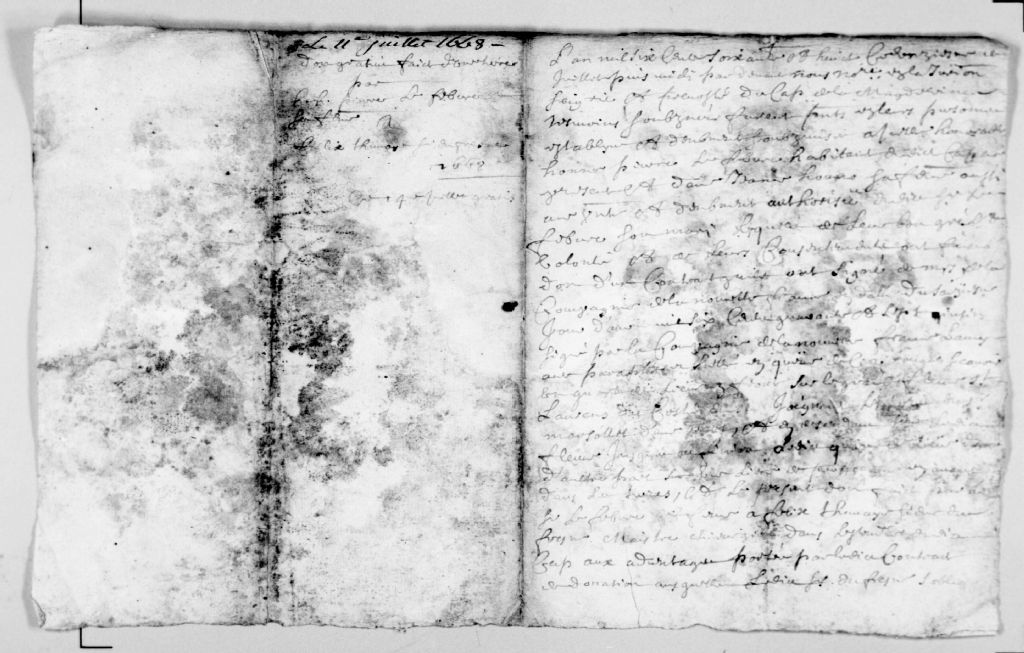- Cette série regroupe 429 pièces judiciaires et notariales du greffe de Jacques de Latouche ainsi qu'un répertoire chronologique. De 1664 à 1669, le notaire De Latouche a exercé à Cap-de-la-Madeleine (du 11 août 1664 au 29 mai 1669).Prises dans leur ensemble, les données colligées dans ces documents officiels à contenu administratif et légal peuvent constituer une source documentaire des plus révélatrices sur le mode et les conditions de vie de la population pendant cette période (métiers et professions mentionnés aux contrats, inventaires de biens, testaments), sur les classes sociales (mention de titres correspondant au rang social des parties concernées tels bourgeois, écuyer, etc), sur les moeurs et coutumes acceptées par la société et ses institutions (par le biais de déclarations, de jugement arbitral, d'injonctions, d'ordonnances, etc), et, dans une proportion moindre, sur la médecine d'époque et ses représentants.Enfin, la terminologie utilisée dans ces contrats notariés pourrait être avantageusement récupérée dans le cadre d'études portant sur l'évolution du langage administratif et légal, voire même sur l'évolution de la langue française