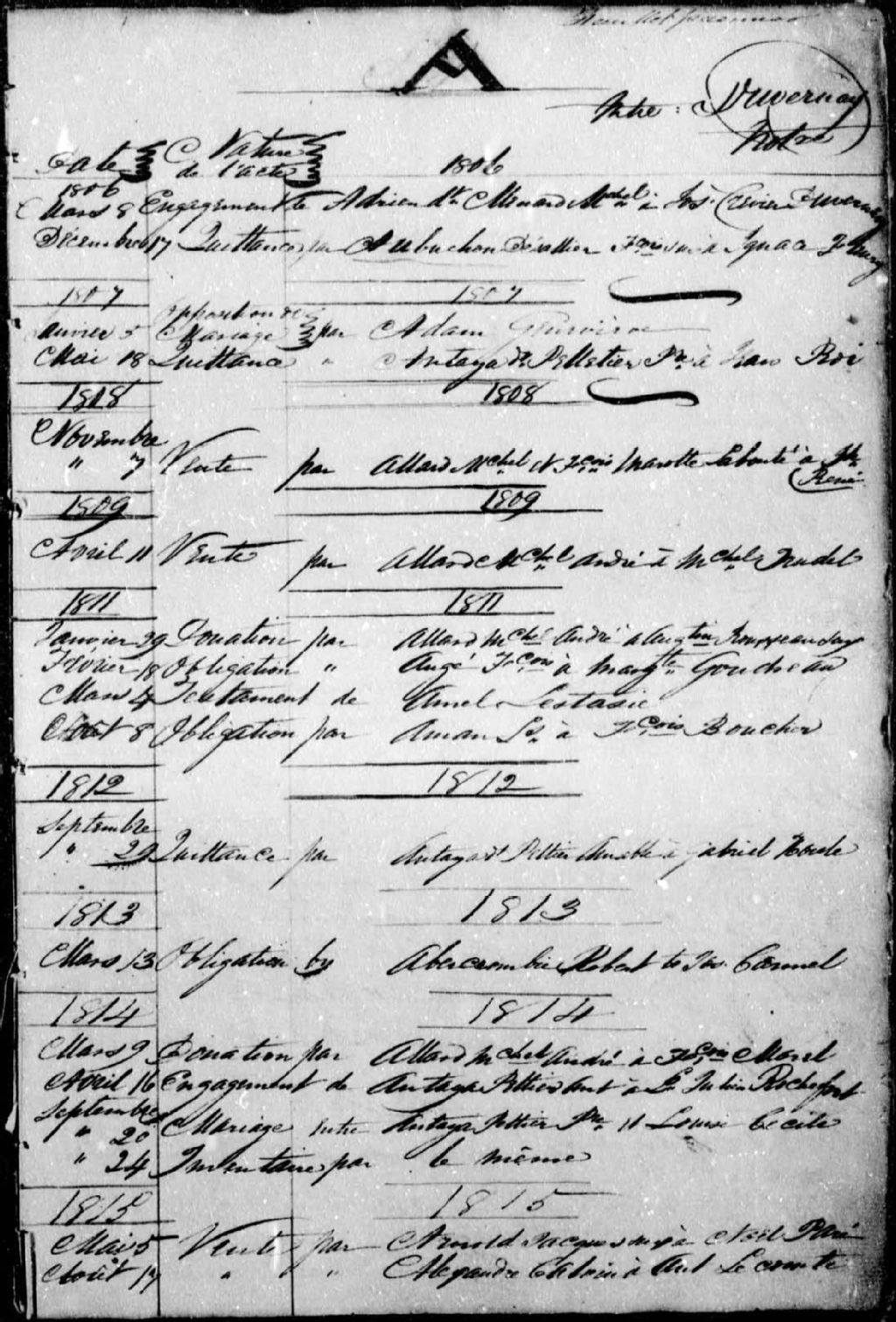 Cette série regroupe 4839 minutes notariales du greffe de Joseph-Marie-G. Crevier-Duvernay ainsi qu'un répertoire onomastique. Les minutes sont numérotées de 1 à 606 entre 1805 et 1809. À la fin du greffe, on retrouve 34 documents incomplets, sans date, non signés ou non répertoriés.De 1805 à 1835, le notaire Crevier-Duvernay a exercé successivement à Verchères (du 2 décembre 1805 au 21 avril 1806), à Berthier (du 25 avril 1806 au 25 mars 1807) et à Nicolet (du 13 avril 1807 au 29 décembre 1835).Prises dans leur ensemble, les données colligées dans ces documents officiels à contenu administratif et légal peuvent constituer une source documentaire des plus révélatrices sur le mode et les conditions de vie de la population pendant cette période (métiers et professions mentionnés aux contrats, inventaires de biens, testaments), sur les classes sociales (mention de titres correspondant au rang social des parties concernées tels bourgeois, [...]