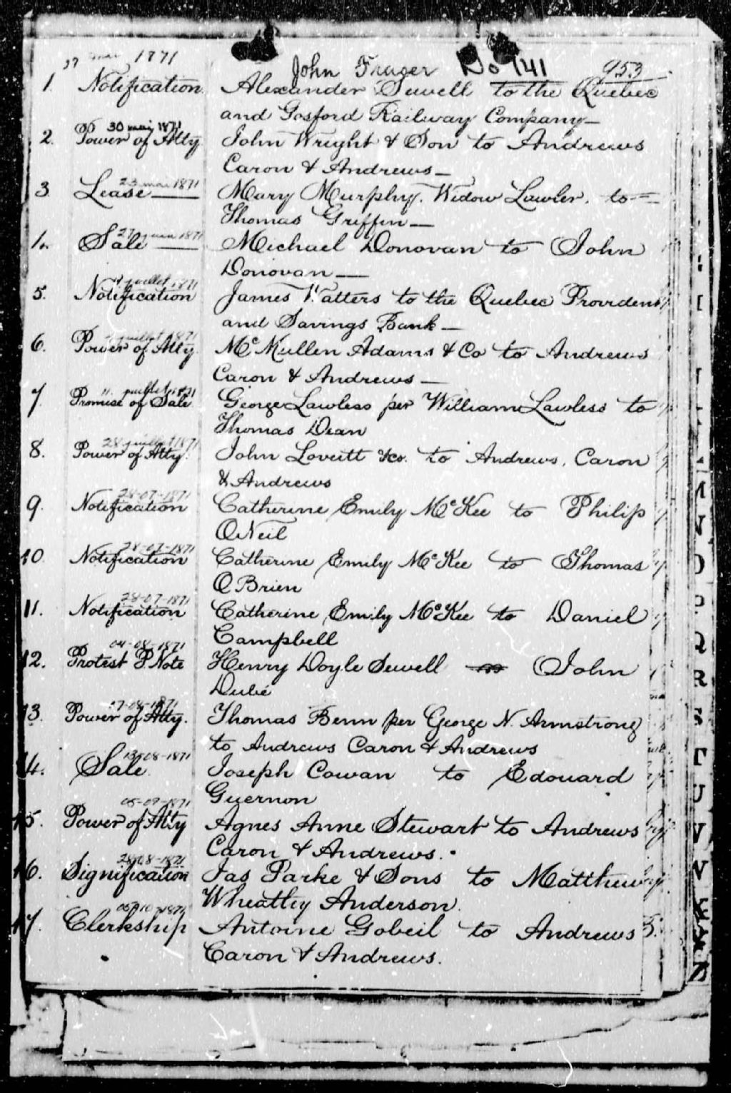 John Fraser, 1871-1876, Archives nationales à Québec, Fonds Cour supérieure. District judiciaire de Québec. Greffes de notaires, (03Q,CN301,S105).