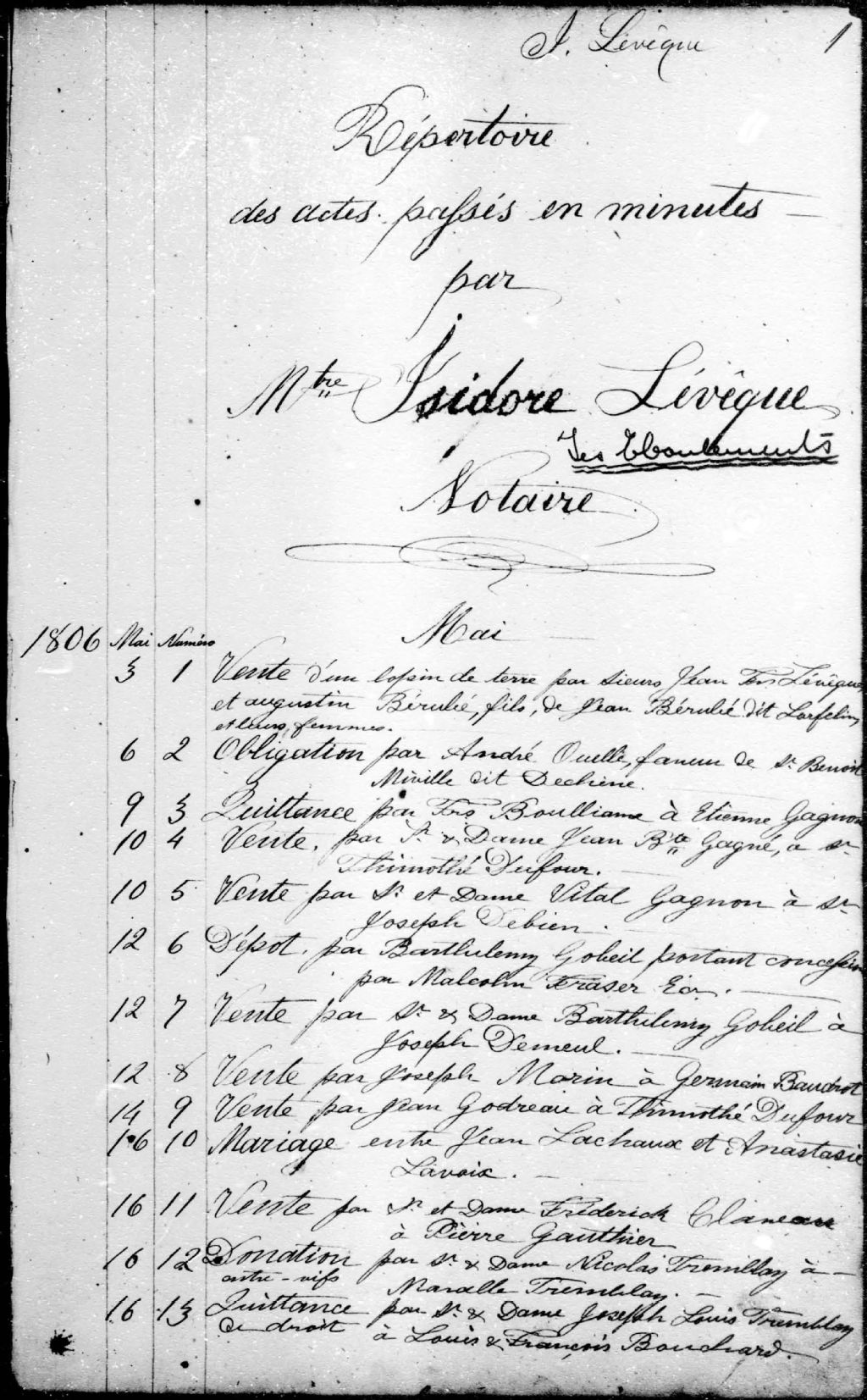 Isidore Lévesque, 1806-1853, Archives nationales à Québec, Fonds Cour supérieure. District judiciaire de Saguenay. Greffes de notaires, (03Q,CN304,S15).