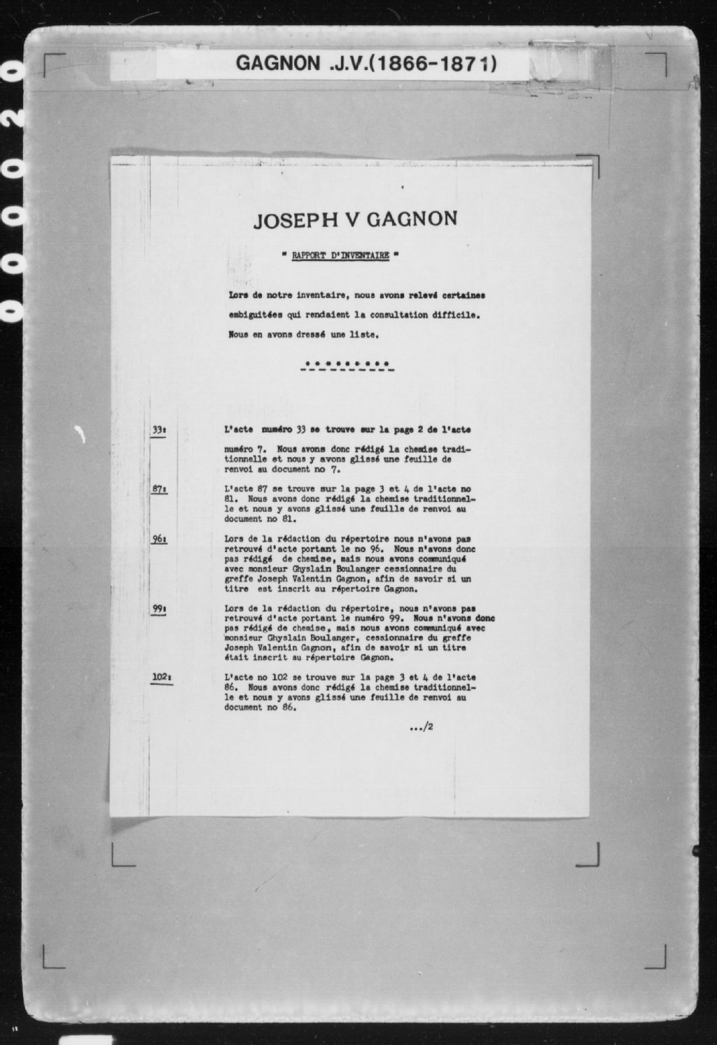 - Joseph-Valentin Gagnon a pratiqué le notariat aux endroits suivnts: Montréal du 28 février au 26 juillet 1866, Saint-Édouard-de-Frampton du 16 août 1866 au 14 décembre 1868, Saint-Joseph-de-Beauce du 17 décembre 1868 au 4 juin 1870, Sainte-Germaine-du-Lac-Etchemin du 25 juin 1870 au 11 mars 1871, Canton de Standon [Beauce] du 14 mars au 20 mai 1871