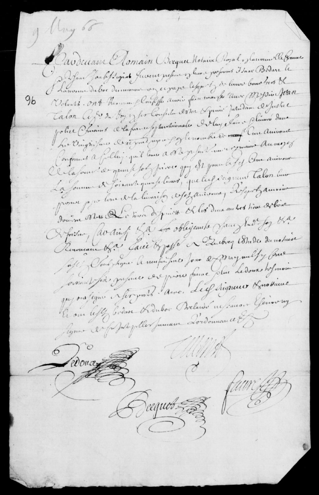 - Romain Becquet a pratiqué le notariat à Québec du [21 décembre] 1665 au 5 mars 1682Avertissement: Le greffe de Romain Becquet comporte des minutes séparées et des cahiers. Or, puisque les minutes séparées et les cahiers recoupent souvent les mêmes périodes de temps, il peut être difficile de repérer la section où se trouve un acte. À cet effet, vous pouvez utiliser les volumes 2 et 3 de l'Inventaire des greffes des notaires du régime français de Pierre-Georges Roy et l'index onomastique des volumes 1 à 8 de cette collection afin de localiser dans quel cahier ou dans quelle séquence de minutes séparées se retrouve le document désiré. Enfin, pour faciliter la tâche de repérage dans BAnQ numérique, nous avons indiqué ci-dessous l'ordre des cahiers et des minutes séparées:15 mai 1662 au 12 novembre 1666 ¿ Minutes séparées nos 1 à 227 (Dans BAnQ numérique, images 1 à 666 dans les actes du 21 décembre 1665 - 9 février 1670)22 août 1667 et 13 septembre 1667 ¿ Minutes séparées nos 228 et 229 (Dans BAnQ numérique, images 667 à 682 dans les actes du 21 décembre 1665 - 9 février 1670)2 octobre 1667 au 9 février 1670 ¿ Chemise no 230 : Cahier 1, 384 folios 229 (Dans BAnQ numérique, images 683 à 1081 dans les actes du 21 décembre 1665 - 9 février 1670)11 janvier 1668 au 14 février 1670 ¿ Minutes séparées nos 231 à 324 (Dans BAnQ numérique, images 1 à 283 dans les actes du 11 janvier 1668 - 13 avril 1671)22 février 1670 au 4 mai 1670 ¿ Chemise no 325: Cahier 2, 42 folios. A la fin du cahier se trouve un inventaire de marchandises et de dettes impliquant la famille Miville. (Dans BAnQ numérique, images 284 à 328 dans les actes du 11 janvier 1668 - 13 avril 1671)2 mars 1670 au 28 avril 1670 ¿ Minutes séparées nos 326 à 337 (Dans BAnQ numérique, images 329 à 397 dans les actes du 11 janvier 1668 - 13 avril 1671)2 mai 1670 au 31 août 1670 ¿ Chemise no 338: Cahier 3, 41 folios (Dans BAnQ numérique, images 398 à 444 dans les actes du 11 janvier 1668 - 13 avril 1671)19 mai 1670 au 30 décembre 1670 ¿ Minutes séparées nos 339 à 408 (Dans BAnQ numérique, images 445 à 655 dans les actes du 11 janvier 1668 - 13 avril 1671)20 août 1670 au 23 novembre 1670 ¿ Chemise no 409: Cahier 4, 132 folios (Dans BAnQ numérique, images 656 à 789 dans les actes du 11 janvier 1668 - 13 avril 1671)30 août 1670 au 5 octobre 1670 ¿ Chemise no 410: Cahier 5, 38 folios (Dans BAnQ numérique, images 790 à 829 dans les actes du 11 janvier 1668 - 13 avril 1671)6 octobre 1670 au 14 novembre 1670 ¿ Chemise no 411: Cahier 6, 47 folios (Dans BAnQ numérique, images 830 à 879 dans les actes du 11 janvier 1668 - 13 avril 1671)1 décembre 1670 au 13 avril 1671 ¿ Chemise no 412: Cahier 7, 40 folios (Dans BAnQ numérique, images 880 à 921 dans les actes du 11 janvier 1668 - 13 avril 1671)14 avril 1671 au 16 août 1671 ¿ Chemise no 413: Cahier 8, 48 folios (Dans BAnQ numérique, images 1 à 53 dans les actes du 14 avril 1671 - 31 octobre 1672)15 août 1671 au 26 octobre 1671 ¿ Chemise no 414: Cahier 9, 47 folios (Dans BAnQ numérique, images 54 à 105 dans les actes du 14 avril 1671 - 31 octobre 1672)7 octobre 1671 au 13 octobre 1671 ¿ Chemise no 415: Cahier 10, 44 folios (Dans BAnQ numérique, images 106 à 153 dans les actes du 14 avril 1671 - 31 octobre 1672)13 octobre 1671 au 29 octobre 1671 ¿ Chemise no 416: Cahier 11, 42 folios (Dans BAnQ numérique, images 154 à 197 dans les actes du 14 avril 1671 - 31 octobre 1672)20 octobre 1671 au 26 décembre 1671 ¿ Chemise no 417: Cahier 12, 28 folios (Dans BAnQ numérique, images 198 à 227 dans les actes du 14 avril 1671 - 31 octobre 1672)30 octobre 1671 au 24 avril 1672 ¿ Chemise no 418: Cahier 13, 30 folios (Dans BAnQ numérique, images 228 à 261 dans les actes du 14 avril 1671 - 31 octobre 1672)13 janvier 1671 au 3 janvier 1672 : Minutes séparées nos 419 à 504 (Dans BAnQ numérique, images 262 à 538 dans les actes du 14 avril 1671 - 31 octobre 1672)8 janvier 1672 au 22 septembre 1672 ¿ Chemise no 505: Cahier 14, 43 folios (Dans BAnQ numérique, images 539 à 597 dans les actes du 14 avril 1671 - 31 octobre 1672)3 janvier 1672 au 6 octobre 1672 ¿ Minutes séparées nos 506 à 585 (Dans BAnQ numérique, images 598 à 781 dans les actes du 14 avril 1671 - 31 octobre 1672)7 octobre 1672 au 18 décembre 1672 ¿ Chemise no 586: Cahier 15, 42 folios (Dans BAnQ numérique, images 782 à 828 dans les actes du 14 avril 1671 - 31 octobre 1672)9 octobre 1672 au 31 octobre 1672 ¿ Minutes séparées nos 587 à 605 (Dans BAnQ numérique, images 829 à 881 dans les actes du 14 avril 1671 - 31 octobre 1672)1 novembre 1672 au 29 décembre 1672 ¿ Minutes séparées nos 606 à 638 (Dans BAnQ numérique, images 1 à 101 dans les actes du 1 novembre 1672 - 21 août 1675)2 janvier 1673 au 5 juin 1673 ¿ Chemise no 639: Cahier 16, 39 folios (Dans BAnQ numérique, images 102 à 143 dans les actes du 1 novembre 1672 - 21 août 1675)4 janvier 1673 au 3 juin 1673 ¿ Minutes séparées nos 640 à 664 (Dans BAnQ numérique, images 144 à 227 dans les actes du 1 novembre 1672 - 21 août 1675)8 juin 1673 au 4 octobre 1673 ¿ Chemise no 665: Cahier 17, 46 folios (Dans BAnQ numérique, images 228 à 277 dans les actes du 1 novembre 1672 - 21 août 1675)11 juin 1673 au 3 septembre 1673 ¿ Minutes séparées nos 666 à 679 (Dans BAnQ numérique, images 278 à 330 dans les actes du 1 novembre 1672 - 21 août 1675)6 septembre 1673 au 17 octobre 1673 ¿ Chemise no 680: Cahier 18, 41 folios (Dans BAnQ numérique, images 331 à 372 dans les actes du 1 novembre 1672 - 21 août 1675)9 septembre 1673 au 15 octobre 1674 ¿ Minutes séparées nos 681 à 691 (Dans BAnQ numérique, images 373 à 413 dans les actes du 1 novembre 1672 - 21 août 1675)16 octobre 1673 au 11 mars 1674 ¿ Chemise no 692: Cahier 19, 40 folios (Dans BAnQ numérique, images 414 à 457 dans les actes du 1 novembre 1672 - 21 août 1675)23 octobre 1673 au 4 mars 1674 