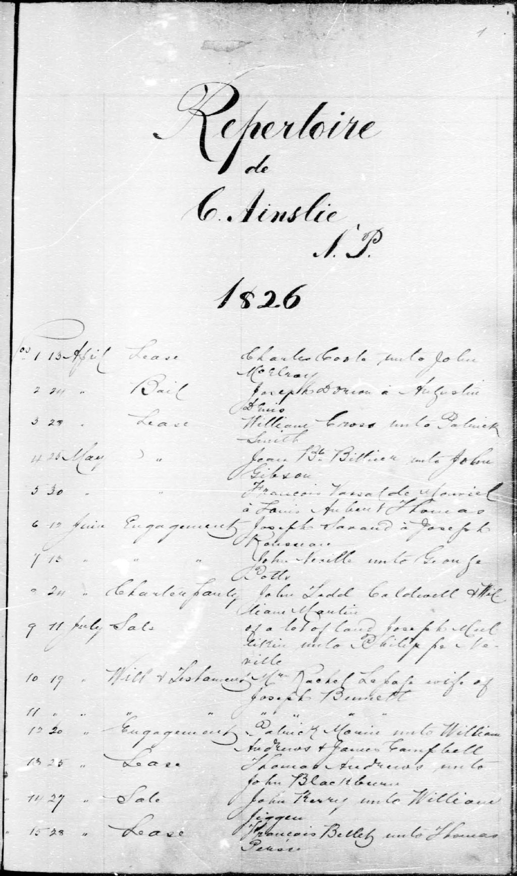 Charles Ainslie, 1826-1828, Archives nationales à Québec, Fonds Cour supérieure. District judiciaire de Québec. Greffes de notaires, (03Q,CN301,S2).