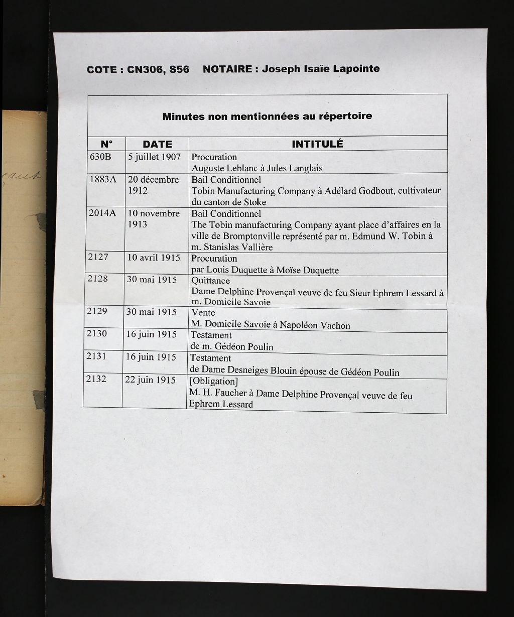 Joseph Isaïe Lapointe, 1904-1915, Archives nationales à Québec, Fonds Cour supérieure. District judiciaire de Beauce. Greffes de notaires, (03Q,CN306,S56).