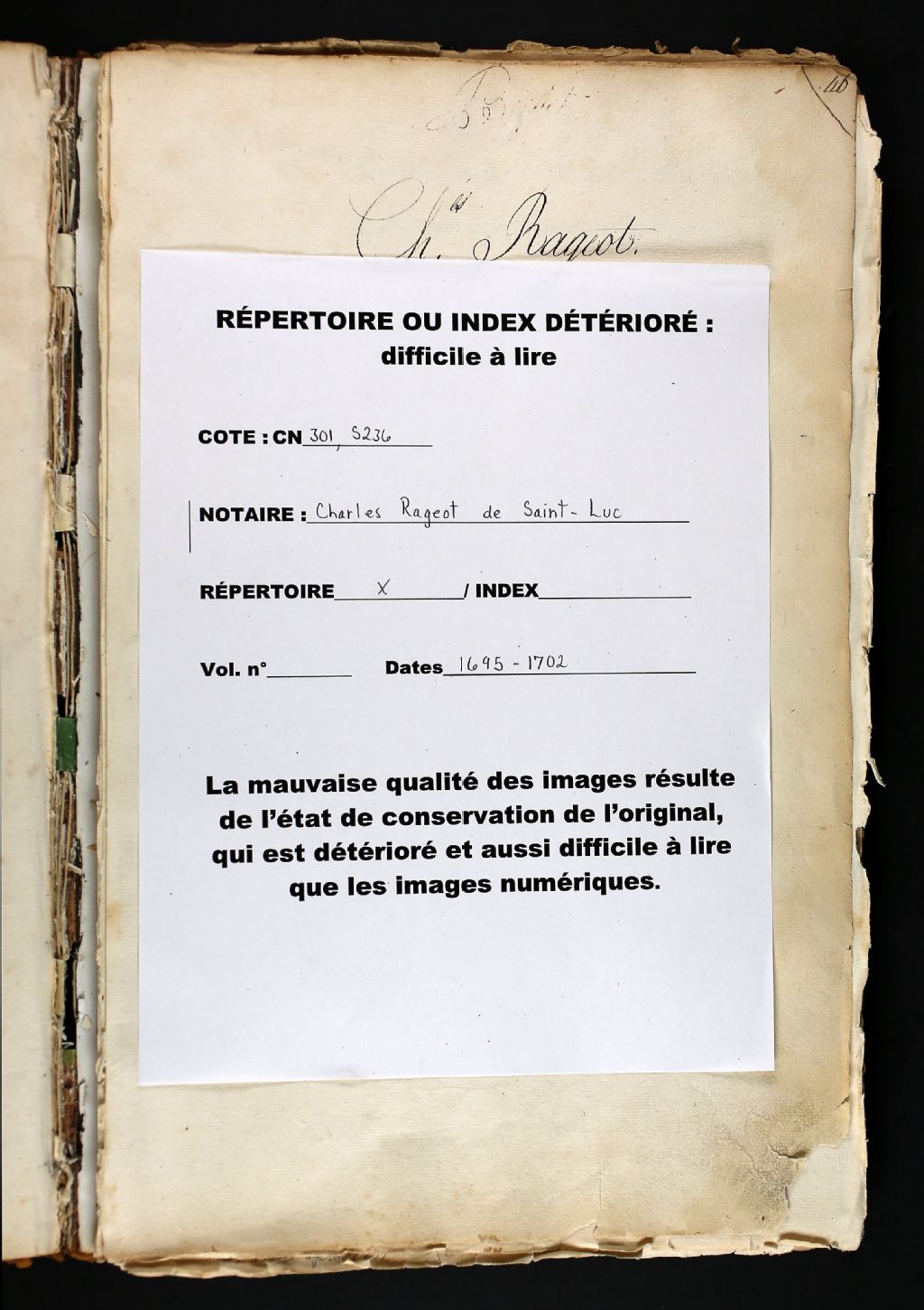 Charles Rageot de Saint-Luc, 1695-1702, Archives nationales à Québec, Fonds Cour supérieure. District judiciaire de Québec. Greffes de notaires, (03Q,CN301,S236).