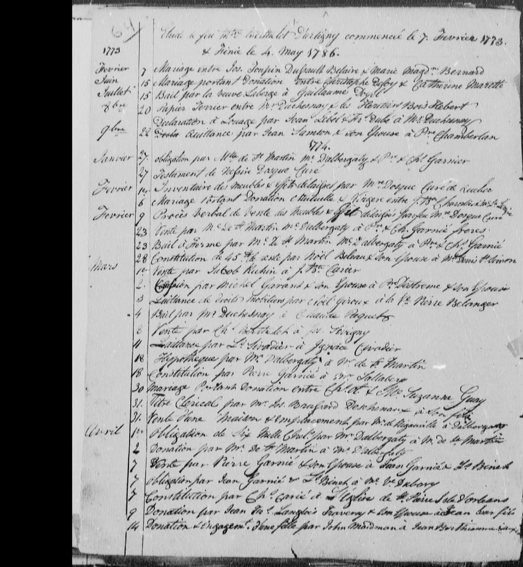 Michel-Amable Berthelot d'Artigny, 1773-1786, Archives nationales à Québec, Fonds Cour supérieure. District judiciaire de Québec. Greffes de notaires, (03Q,CN301,S25).