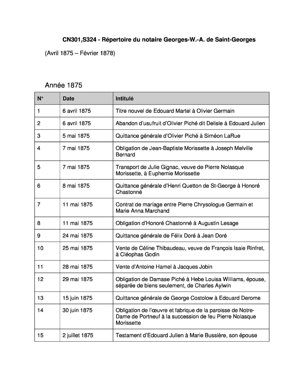 Georges-W.-A. de Saint-Georges, 1875-1878, Archives nationales à Québec, Fonds Cour supérieure. District judiciaire de Québec. Greffes de notaires, (03Q,CN301,S324).